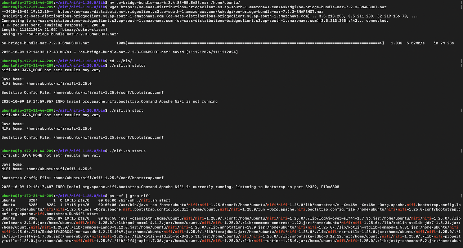 Once Java 17 is installed, download the latest version of Nar into the lib folder and start the NiFi client as shown in the screenshot below.