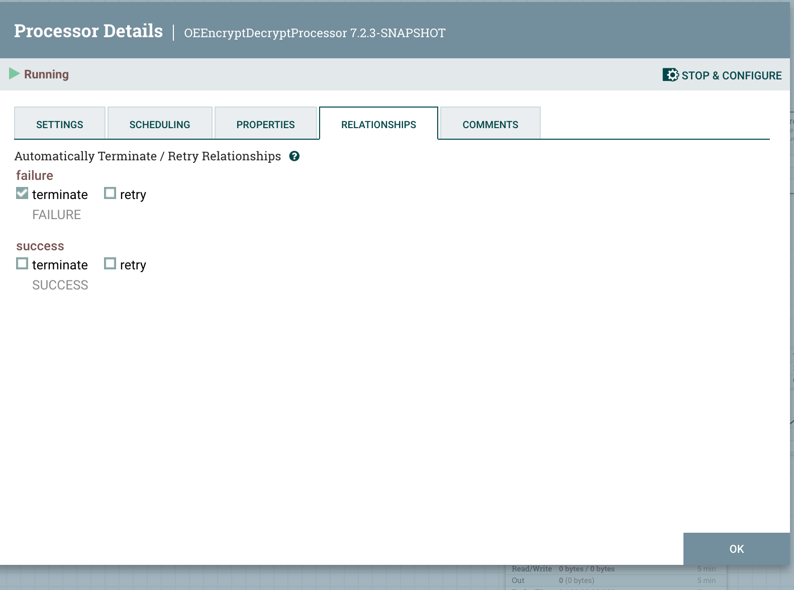 Right-click on OEEncryptDecryptProcessor and in relationships, select the terminate and click the OK button.