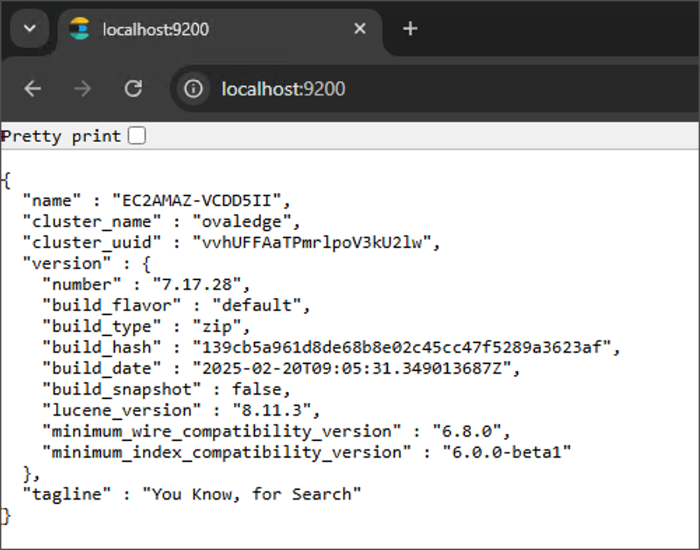 { "name" : "YOUR-NODE-NAME", "cluster_name" : "elasticsearch", "cluster_uuid" : "xxxxxxxxxxxxxxxxx", "version" : { "number" : "7.17.28" } }article