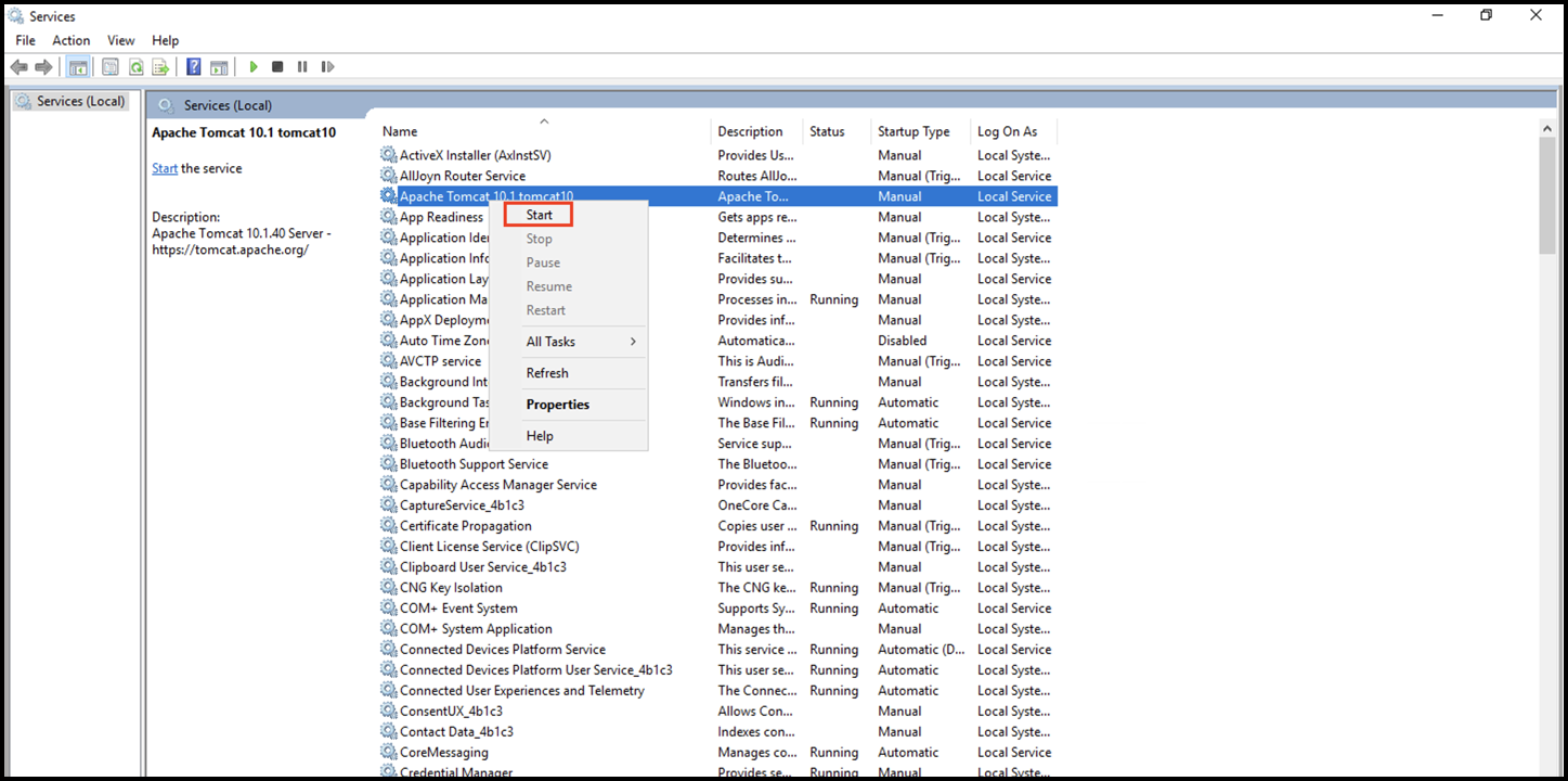 service.bat uninstall <ServiceName>service.bat install tomcat10tomcat10w.exe //ES//tomcat10-DOVALEDGE_SECURITY_TYPE=db -DOVALEDGE_ENCRYPT_DECRYPT_KEY=<encrypt_decrypt_key> -Dext.properties.dir=file:C:/path/to/ovaledge/ext-prop/ -Dlog4j.configuration=file:C:/path/to/ovaledge/ext-prop/log4j.properties --add-opens java.base/jdk.internal.loader=ALL-UNNAMED --add-opens jdk.zipfs/jdk.nio.zipfs=ALL-UNNAMED --add-opens java.base/java.net=ALL-UNNAMED --add-opens java.base/java.time=ALL-UNNAMED --add-opens java.base/java.nio=ALL-UNNAMED