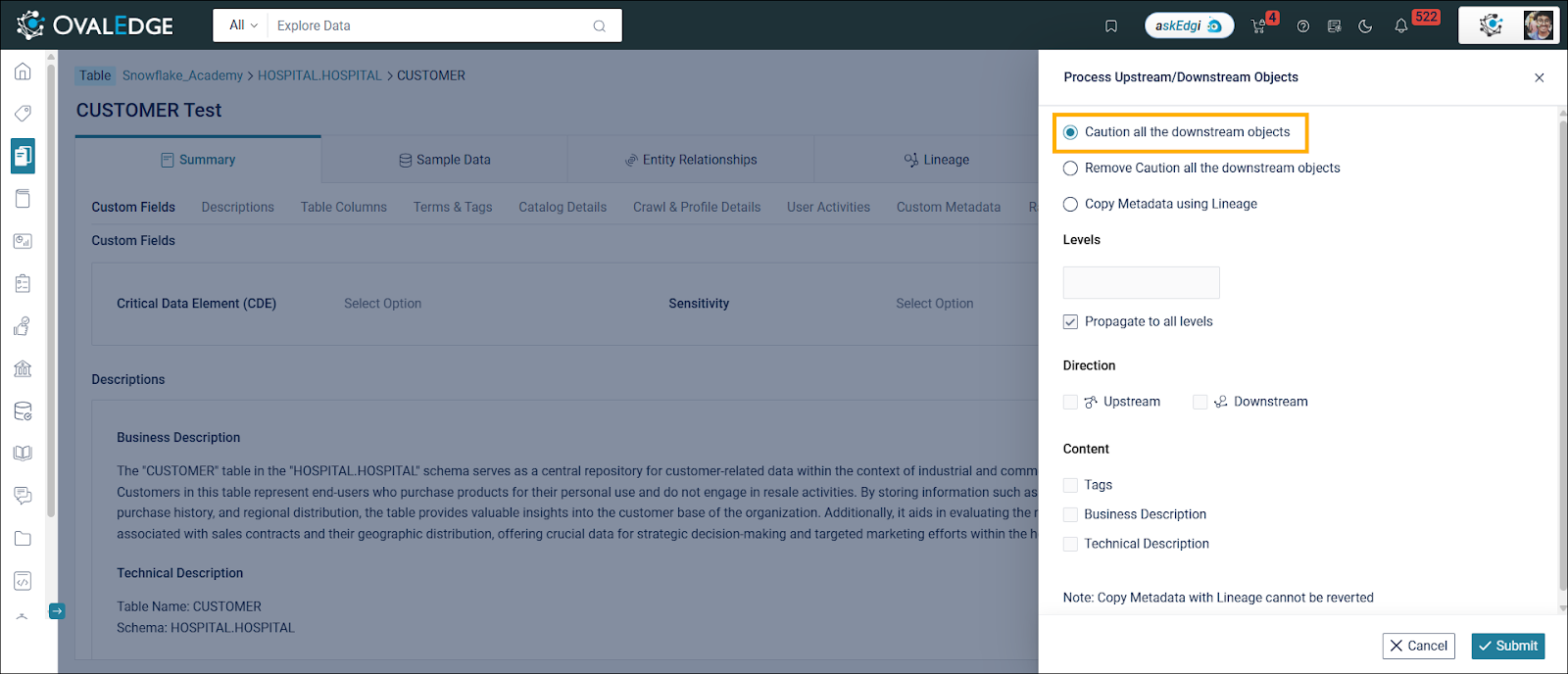 When certifying an object as “Cautioned”, the option “Caution Downstream Objects' can be selected to propagate the cautioned label to downstream objects in the lineage. Also, within the object summary page, 9-dots > Process upstream or downstream objects > Caution all downstream objects" radio button can be used.