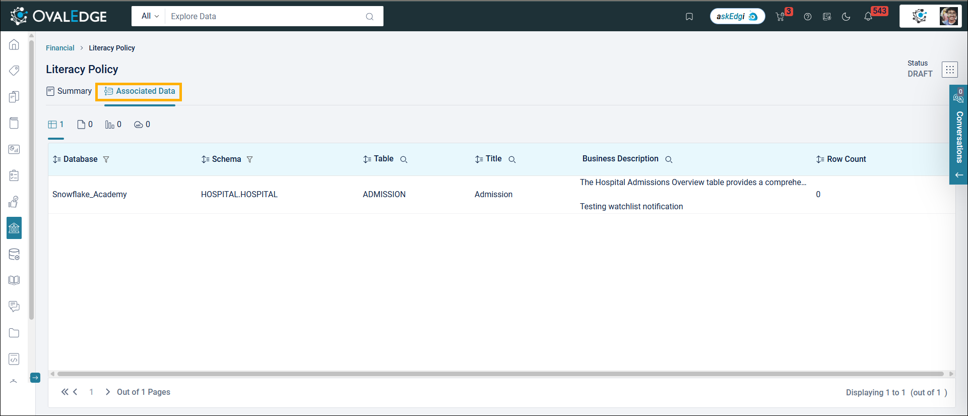 When a policy is run and the objects are certified based on the policy rules, the associated objects are displayed on the Associated Data page of the Policy rule. The associated data is split into 4 object types: Tables, Files, Reports and APIs.