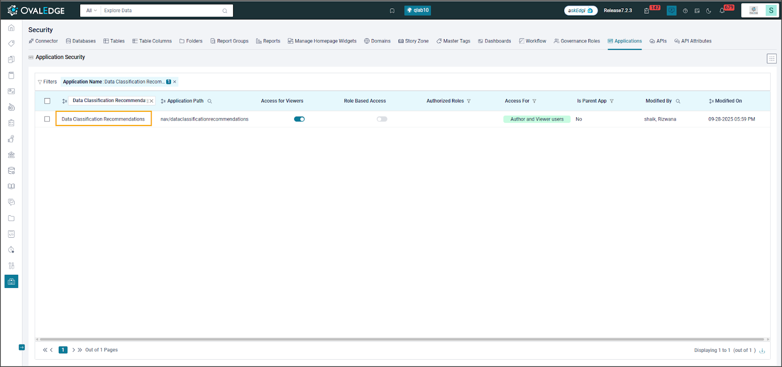 Access to the Data Classification Recommendation is handled through Application Security. Users with an Author license in the Authorized Roles section can access the Data Classification Recommendation Modules and create Models. Stewards of the term and data objects with access to the Data Classification Recommendation page can also visit the page and accept or reject the recommendations.