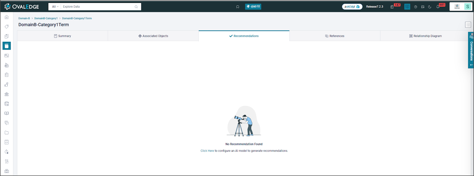 Users can view recommended data objects for terms.