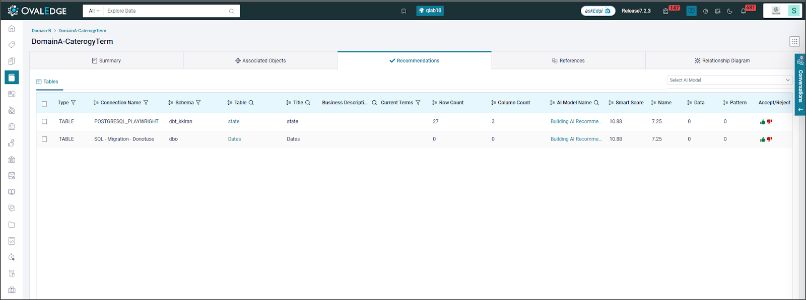 Example: The Term “Customer” is curated in the Business Glossary. Stakeholders can configure AI recommendation Keywords for this term, like Client, Customer_name, prospectus, etc, to get recommendations for the data object matching these keywords.