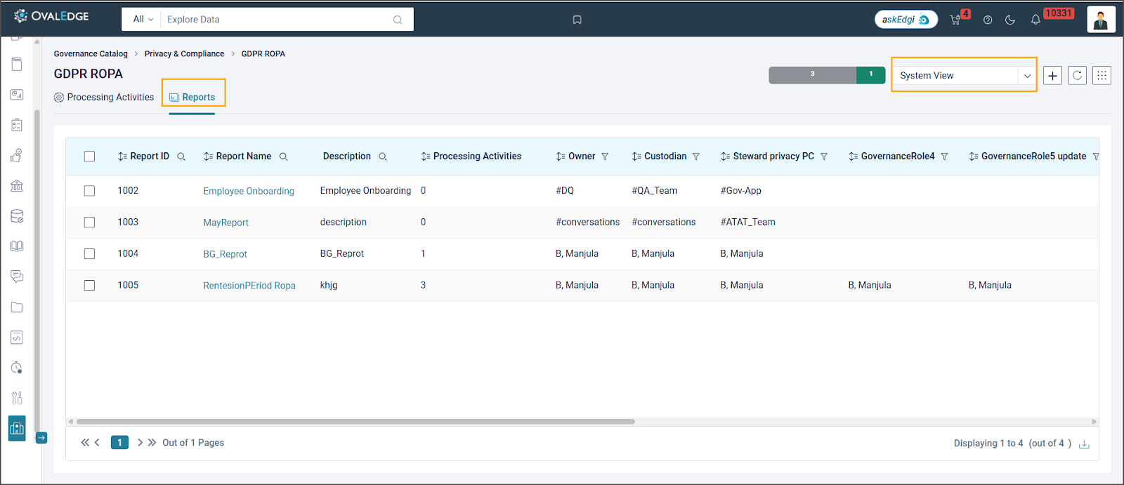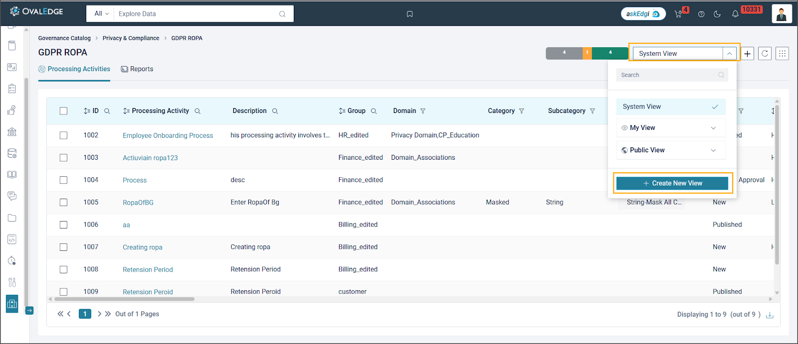 Once Users have created personalized views in OvalEdge, accessing and managing them becomes effortless. They can easily navigate to the GDPR ROPA and find the System View dropbutton at the screen’s top-right corner.