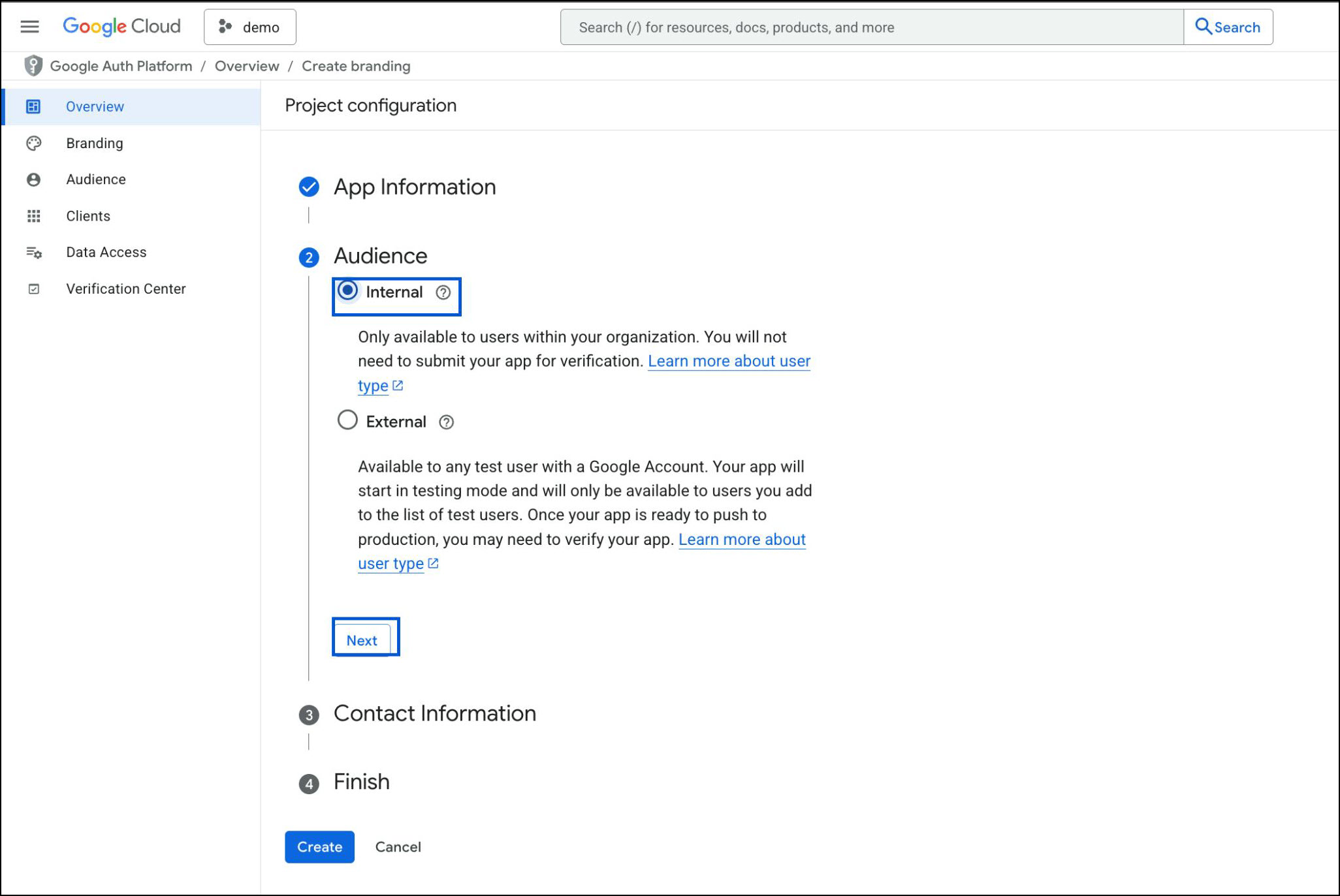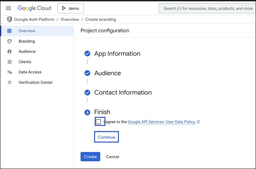 Once all sections show a checkmark (App Information, Audience, Contact Information, Finish), click Create.