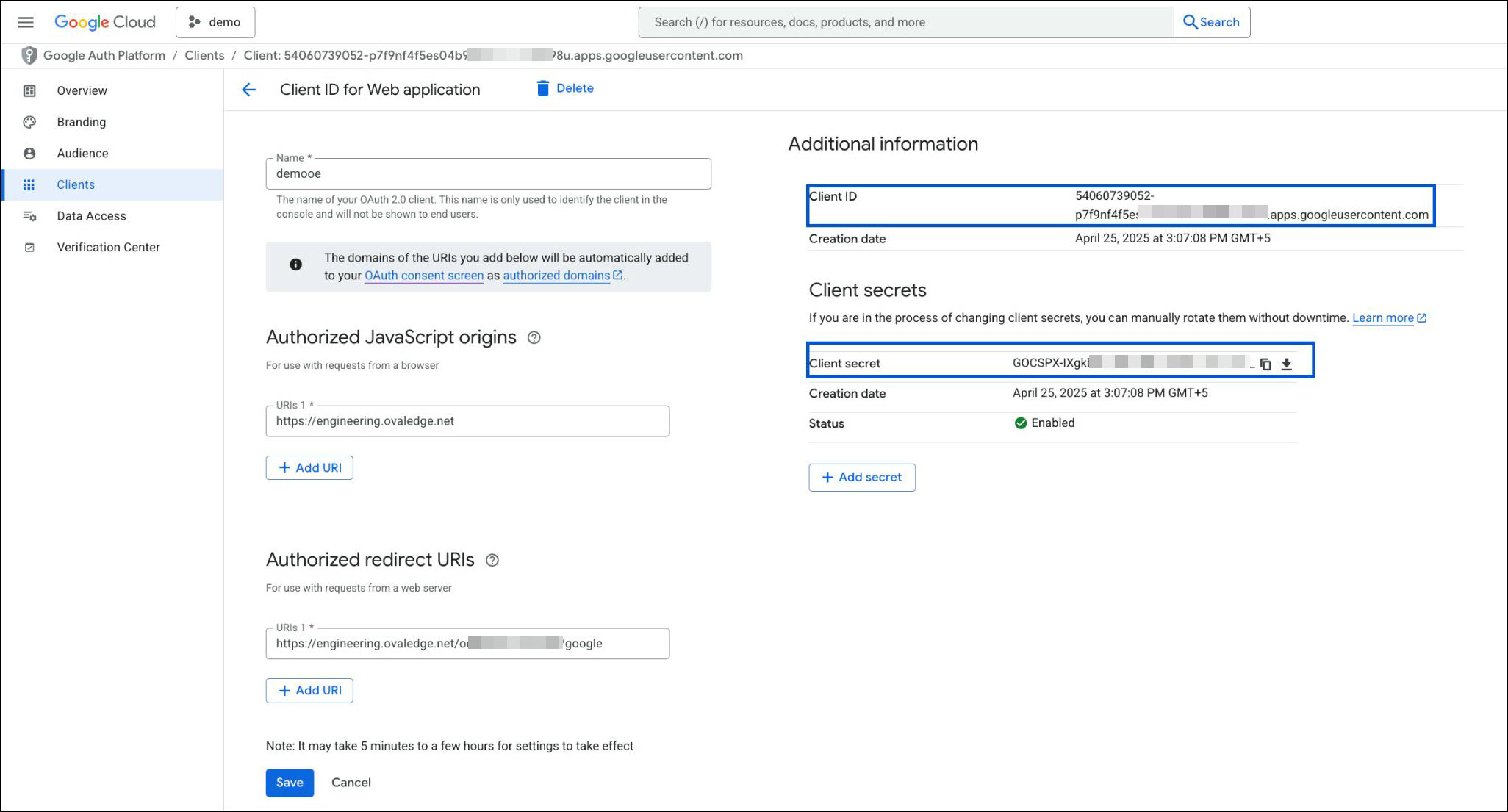 From the Additional Information section, copy the Client ID and Client Secret. These will be used in the OvalEdge configuration.