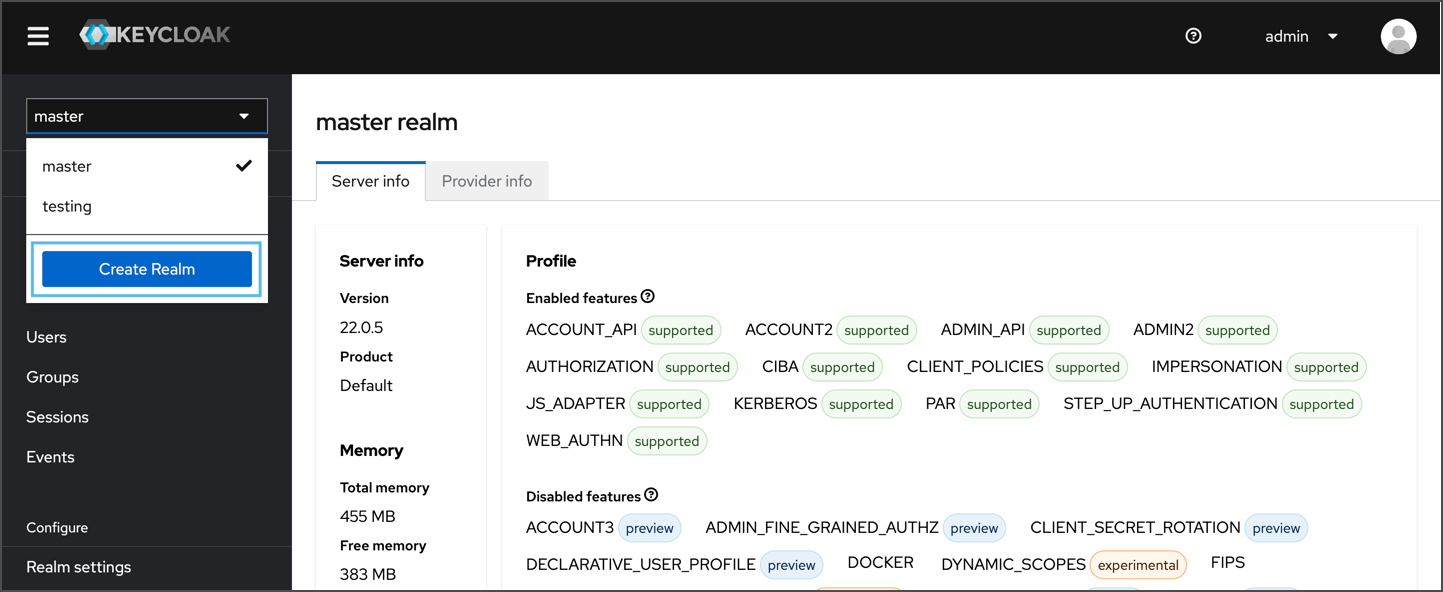 Use the dropdown in the top-left corner to switch to the newly created realm.