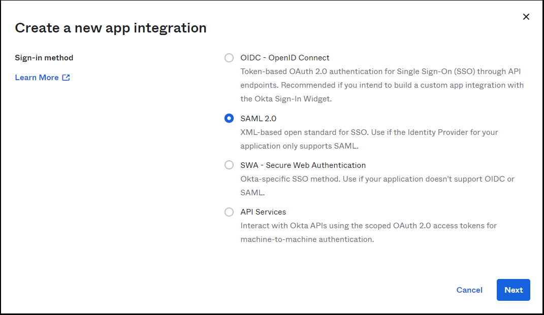 Select SAML 2.0 from the list of available options and click on the Next button.