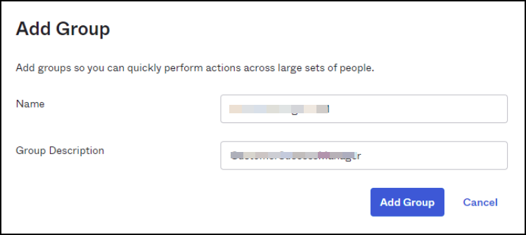To maintain group management in the OKTA, click on Add Group and enter Name and Group Description.