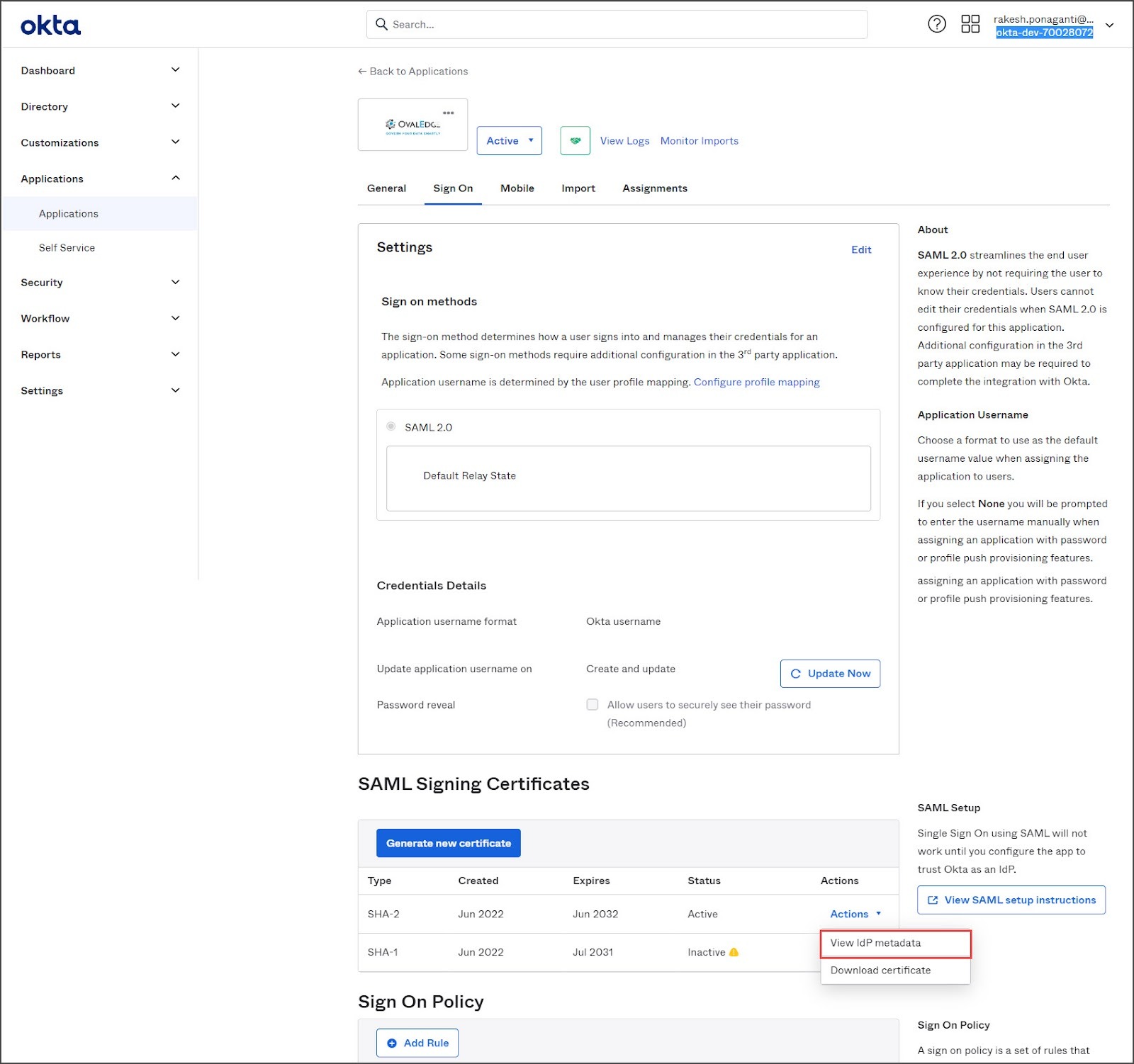 Capture the Identity Provider metadata URL from the OKTA portal, as mentioned in the screenshot below.
