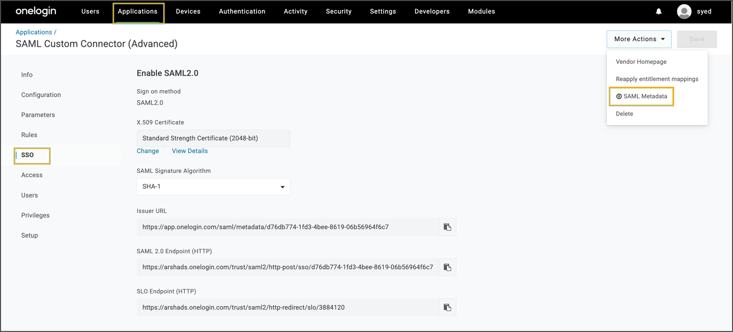 Navigate to Applications > SSO > More Actions > SAML Metadata.