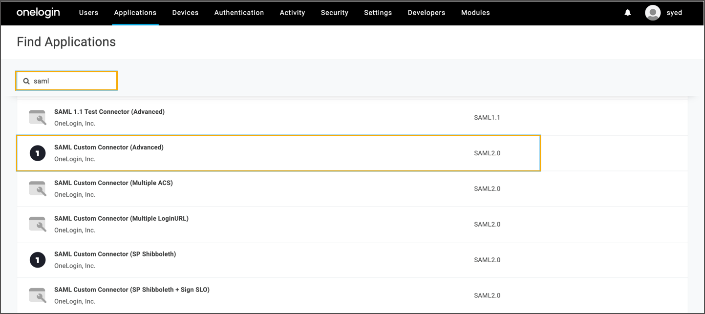 Search and select SAML Custom Connector (Advanced).