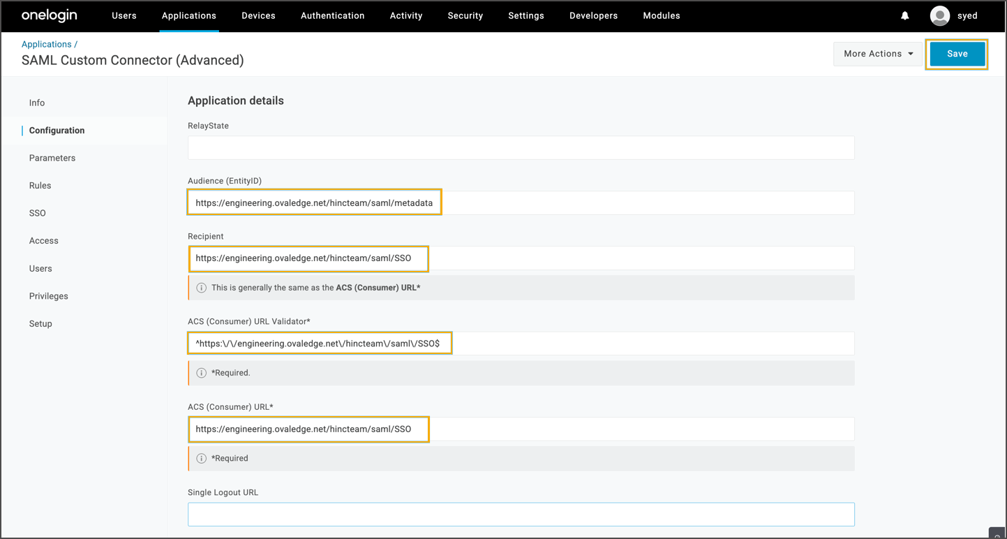 https://<DNS-IP>/ovaledge/saml/SSOClick Save.