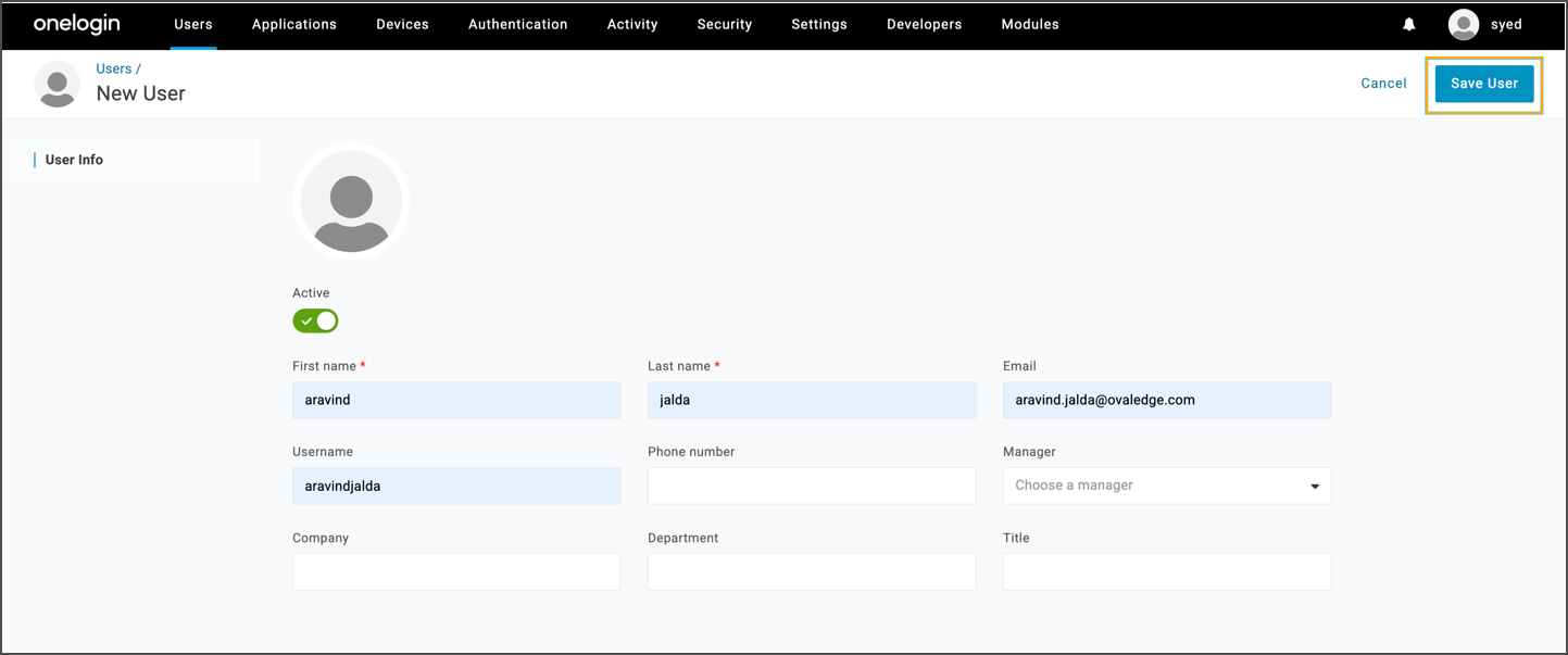 Fill in user details, and clicking Save User.