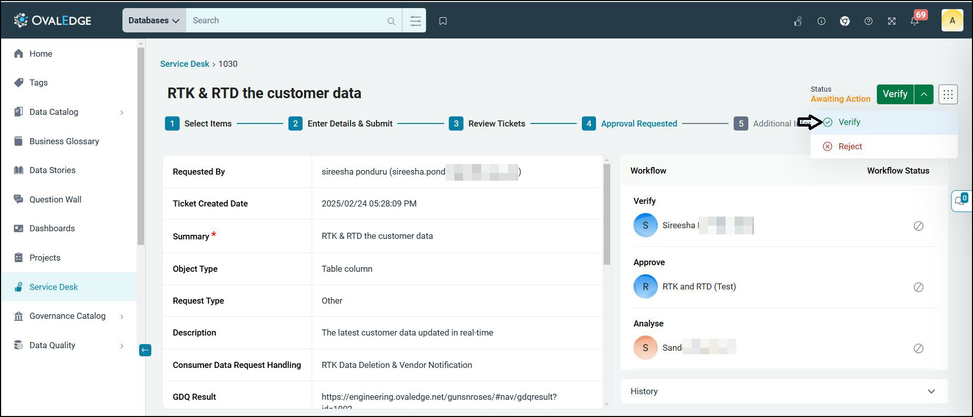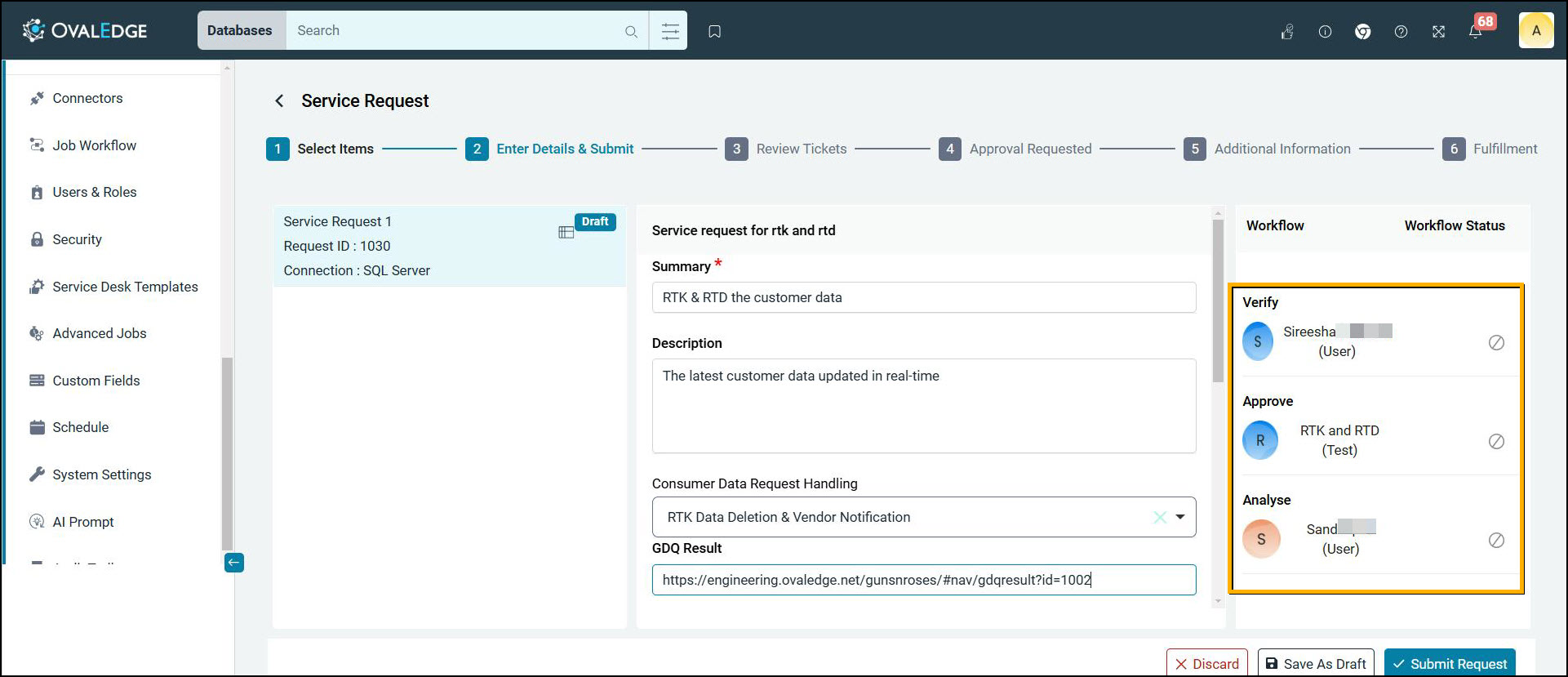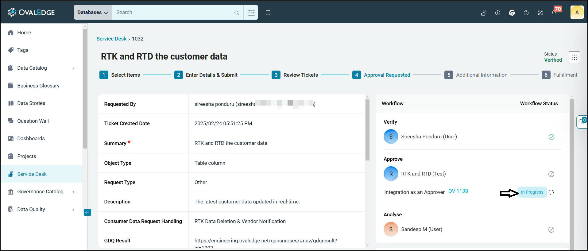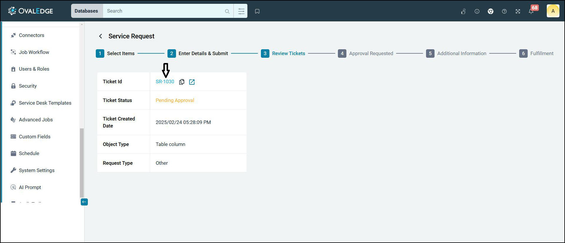 If a service request is created in OvalEdge, it awaits approval from JIRA, displaying the JIRA ticket ID and status.