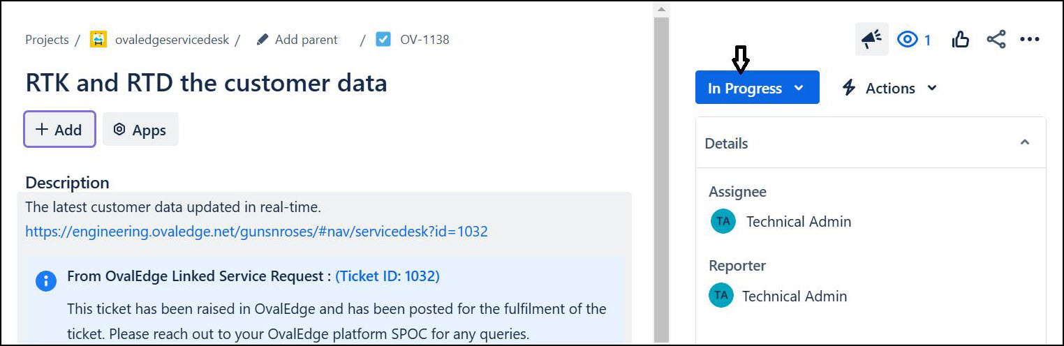 Status changes in JIRA are synchronized with the corresponding service request in OvalEdge.