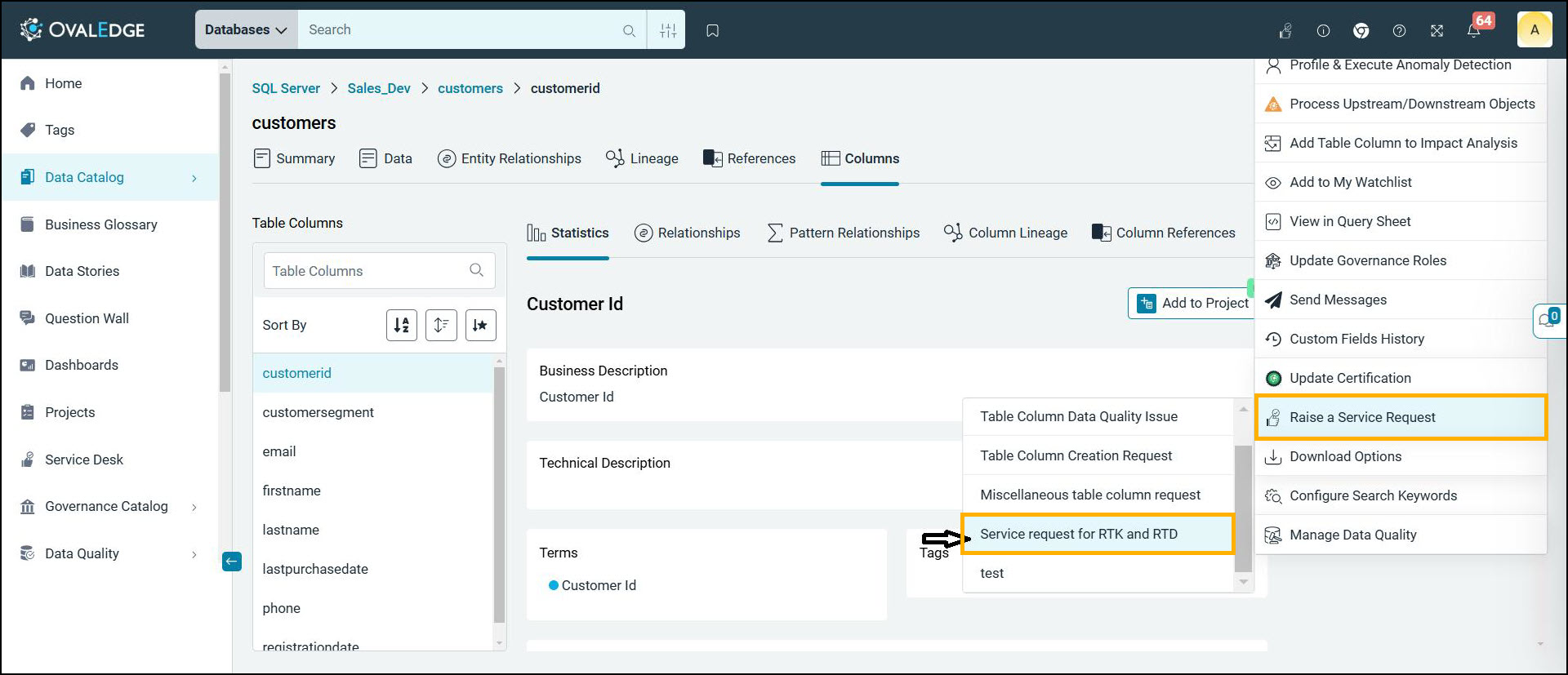 Locate and select the data object (e.g., a table column) for which a service request needs to be created—example: Table Column – Customer ID.