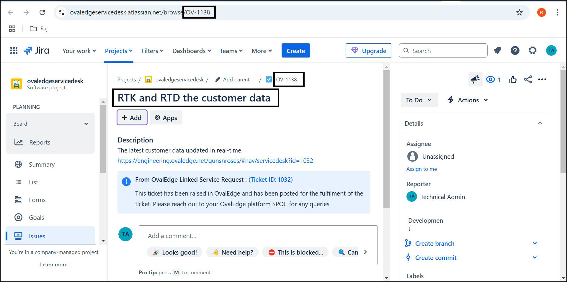 In JIRA, locate the ticket created from the OvalEdge service request.