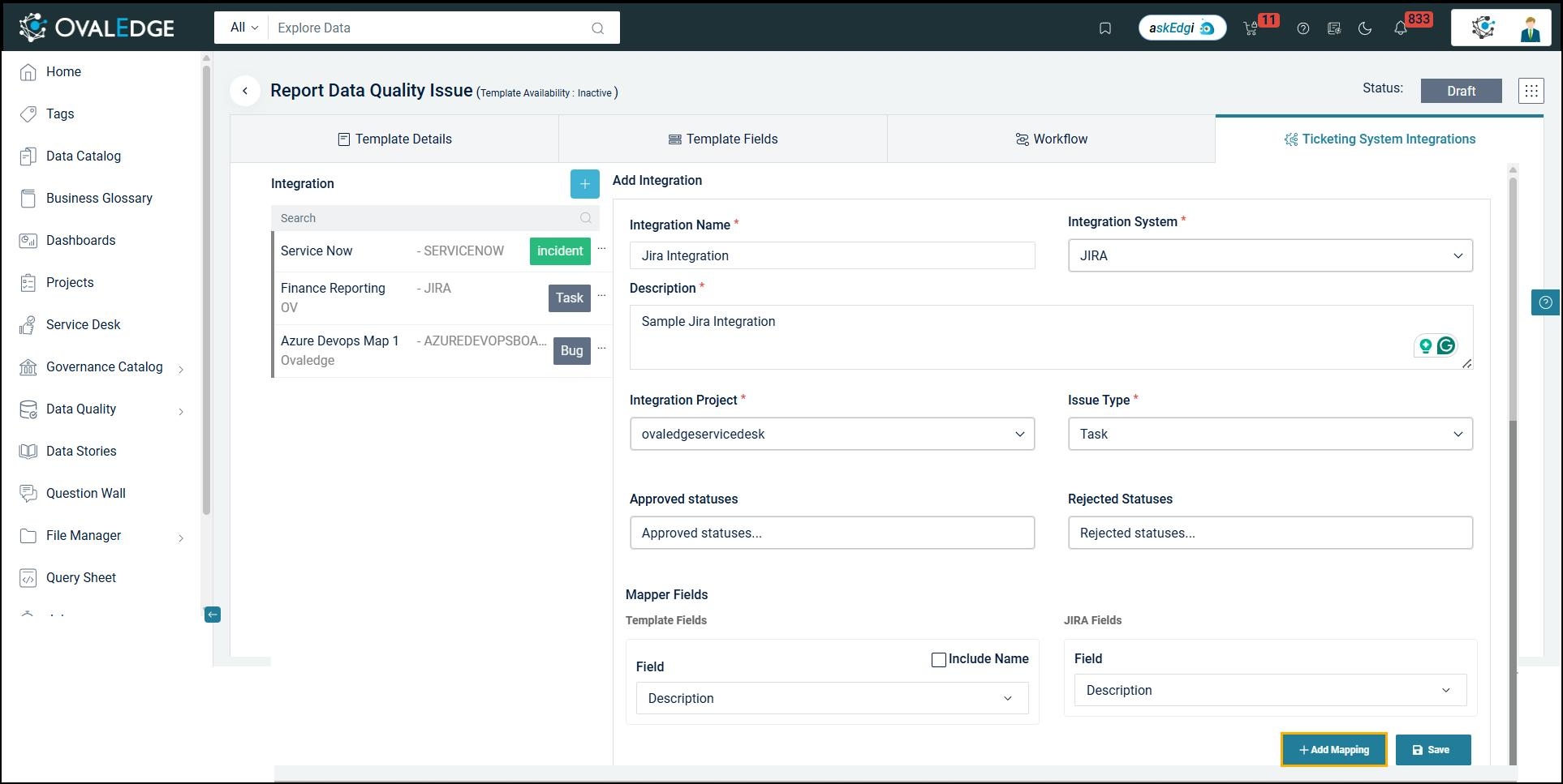 In the Description field, briefly explain the integration (e.g., "Maps IT support tickets from OvalEdge to JIRA for tracking and resolution").