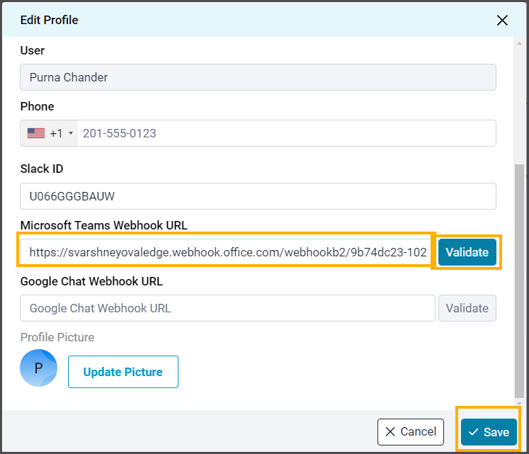 Click on the "Edit Profile" or the edit icon. Enter the Workflow link in the Microsoft Teams Workflow URL field.