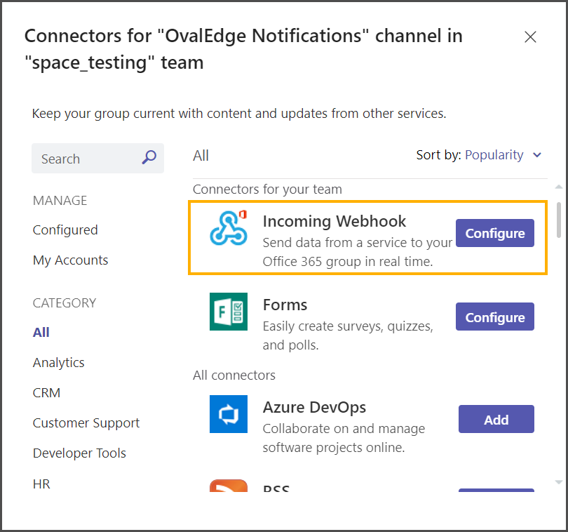Select the Incoming Webhook and click on the Configure button.