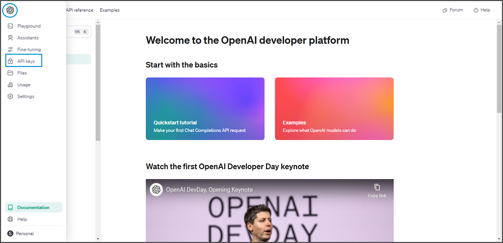 Users can access the OpenAI (ChatGPT)Developer Platform and navigate to the left-side pane by hovering over the OpenAI symbol. The available options include selecting API Keys.