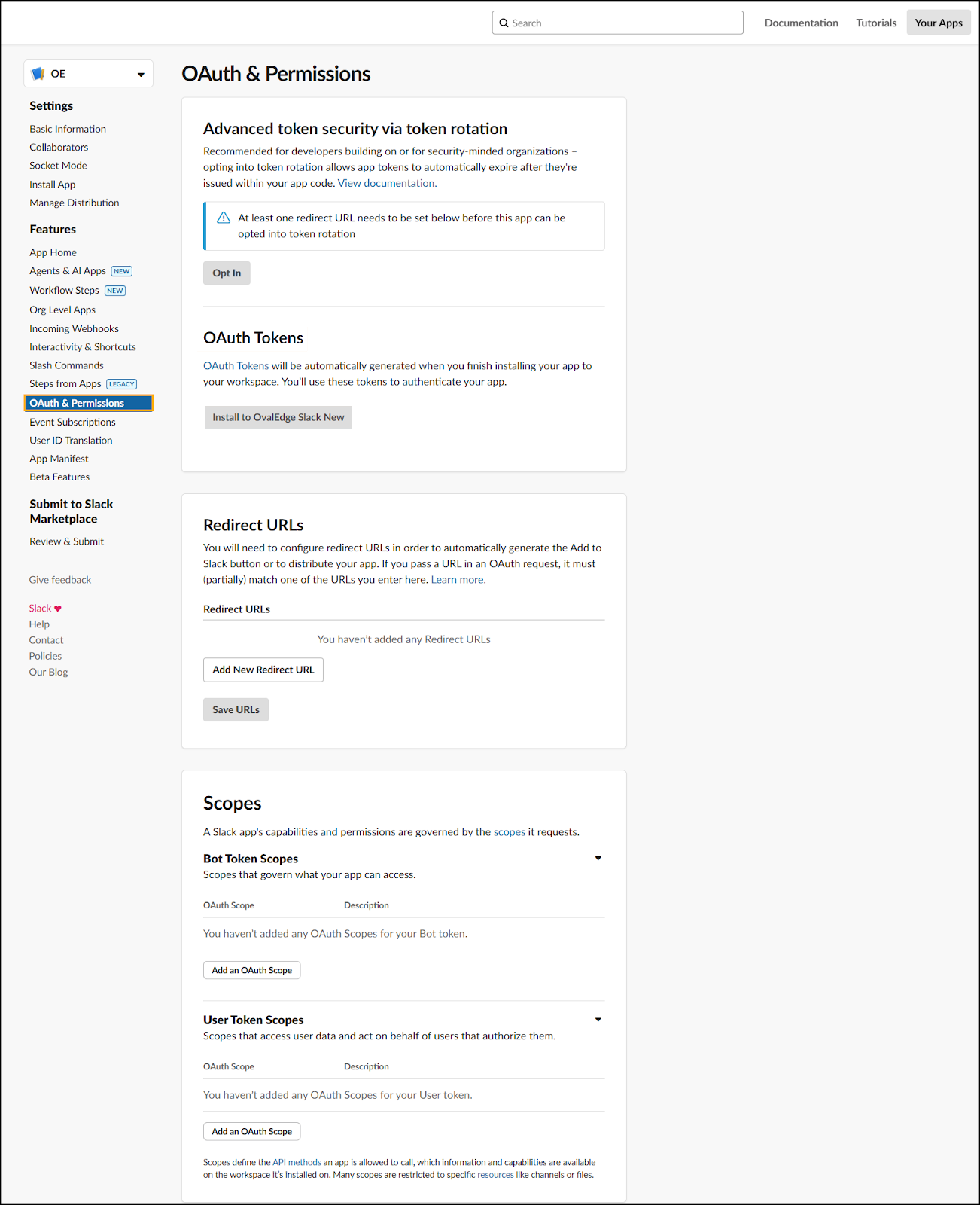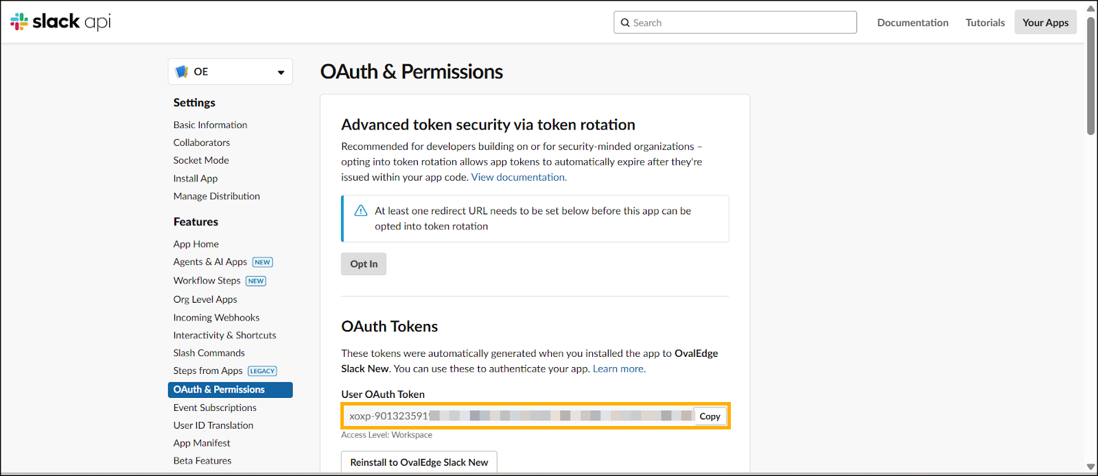 Copy the User OAuth Token and paste it in the OvalEdge Slack Configuration.