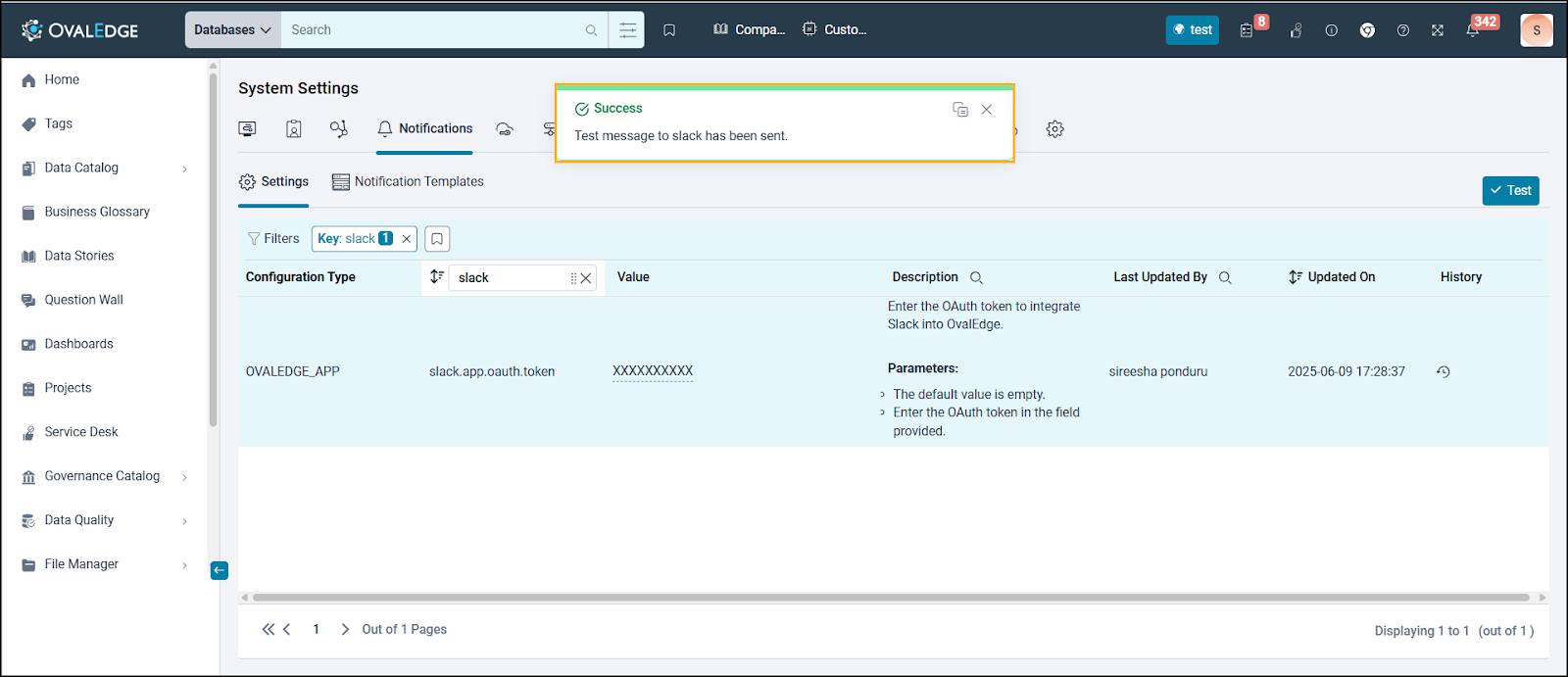 A message “Successfully sent Test Message to Slack” is displayed. Here, the Test message from the Ovaledge application is sent to Slack.