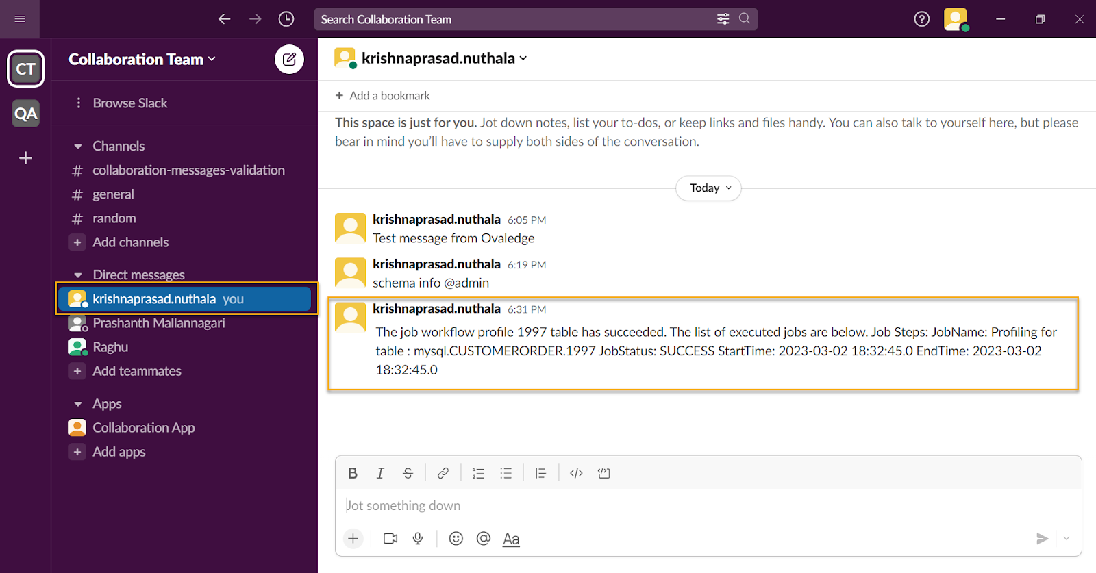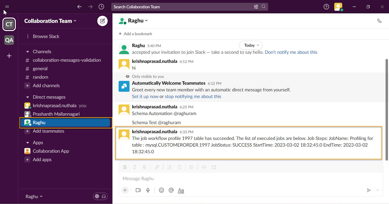 Verify the Job Workflow notification message in the Teammate Slack.