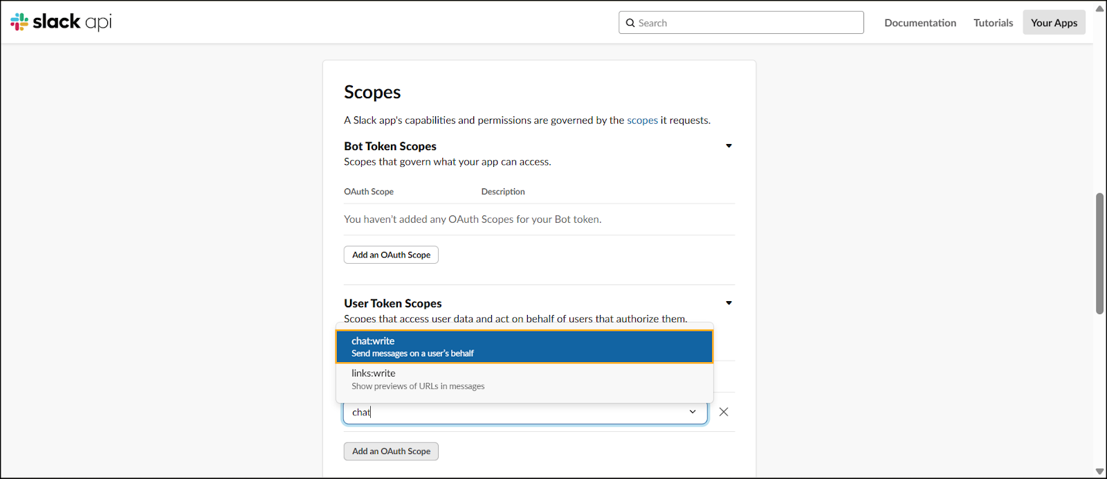 Scroll down to the User Token Scopes section, select the chat:write permission from the dropdown.