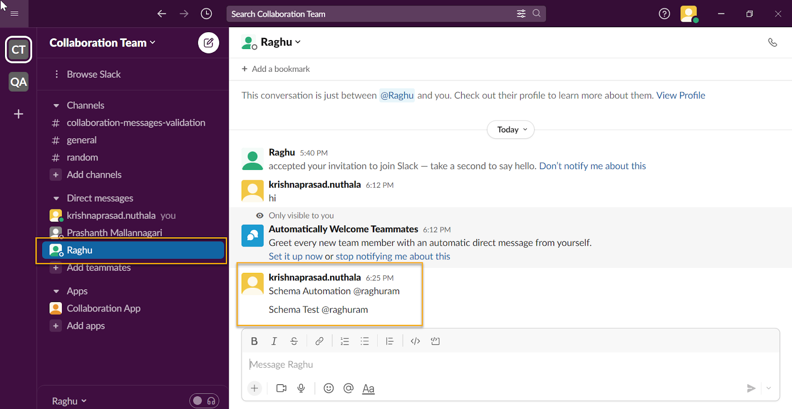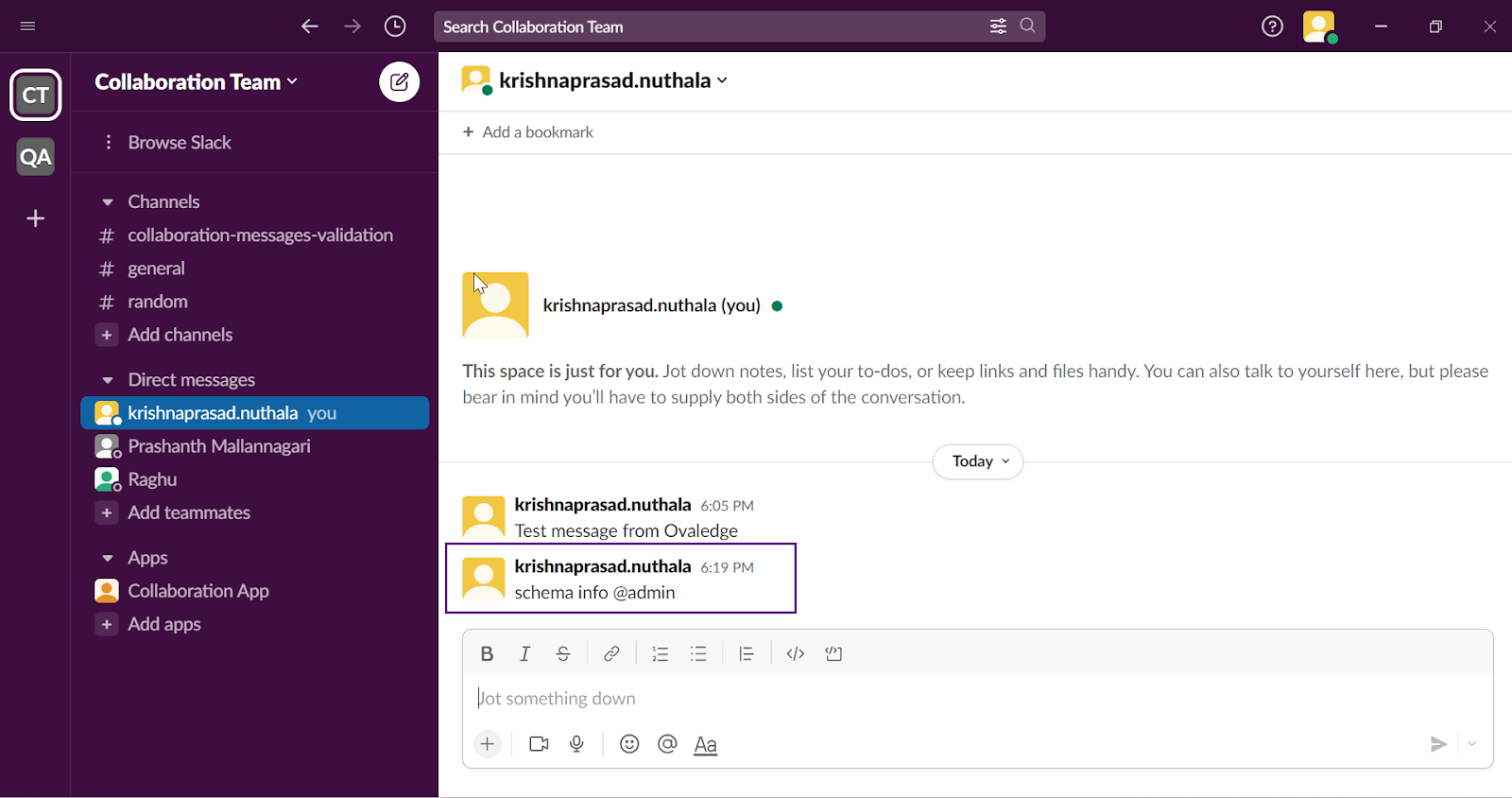 Verify the Collaboration Test message in Slack.