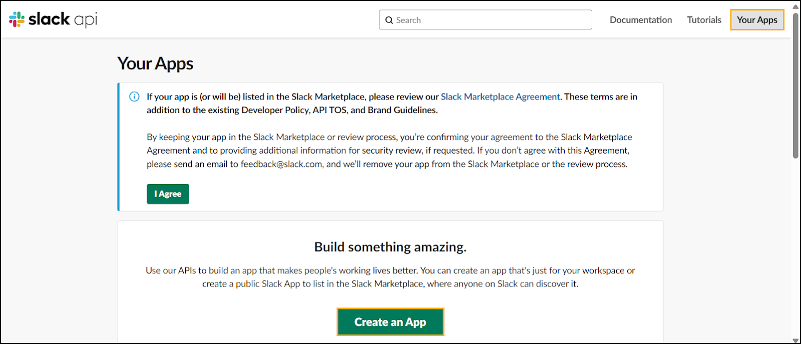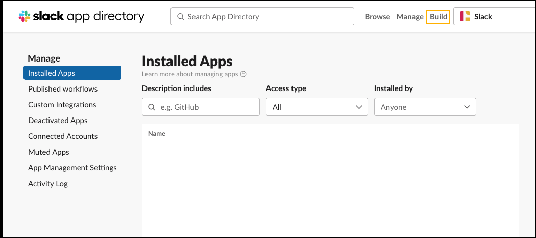 In the header menu, click on the Build option. The Your Apps page is displayed.