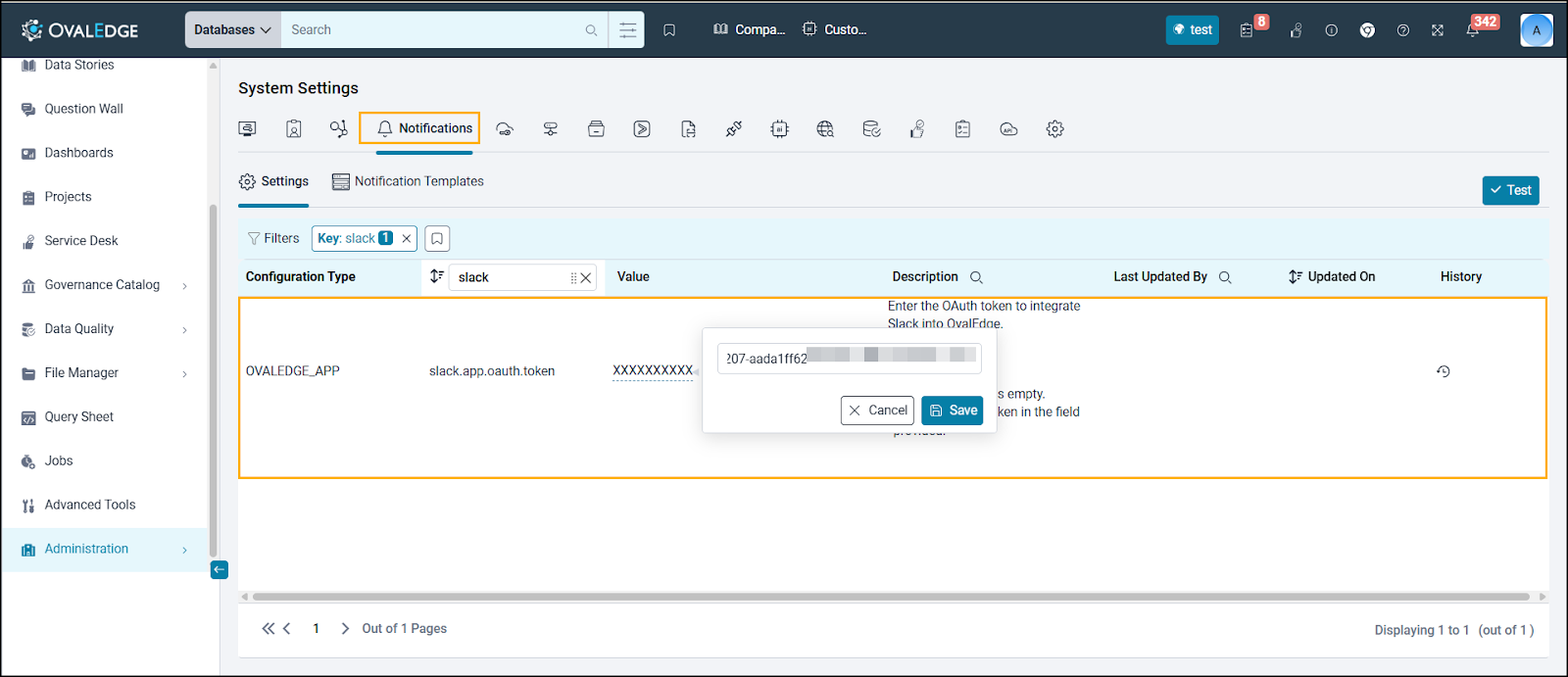 In the left menu, navigate to Administration > System Settings > Notifications > Settings. Search with the Key (slack.app.oauth.token), add the User OAuth Token generated in the previous step in the Value field, and click Save.