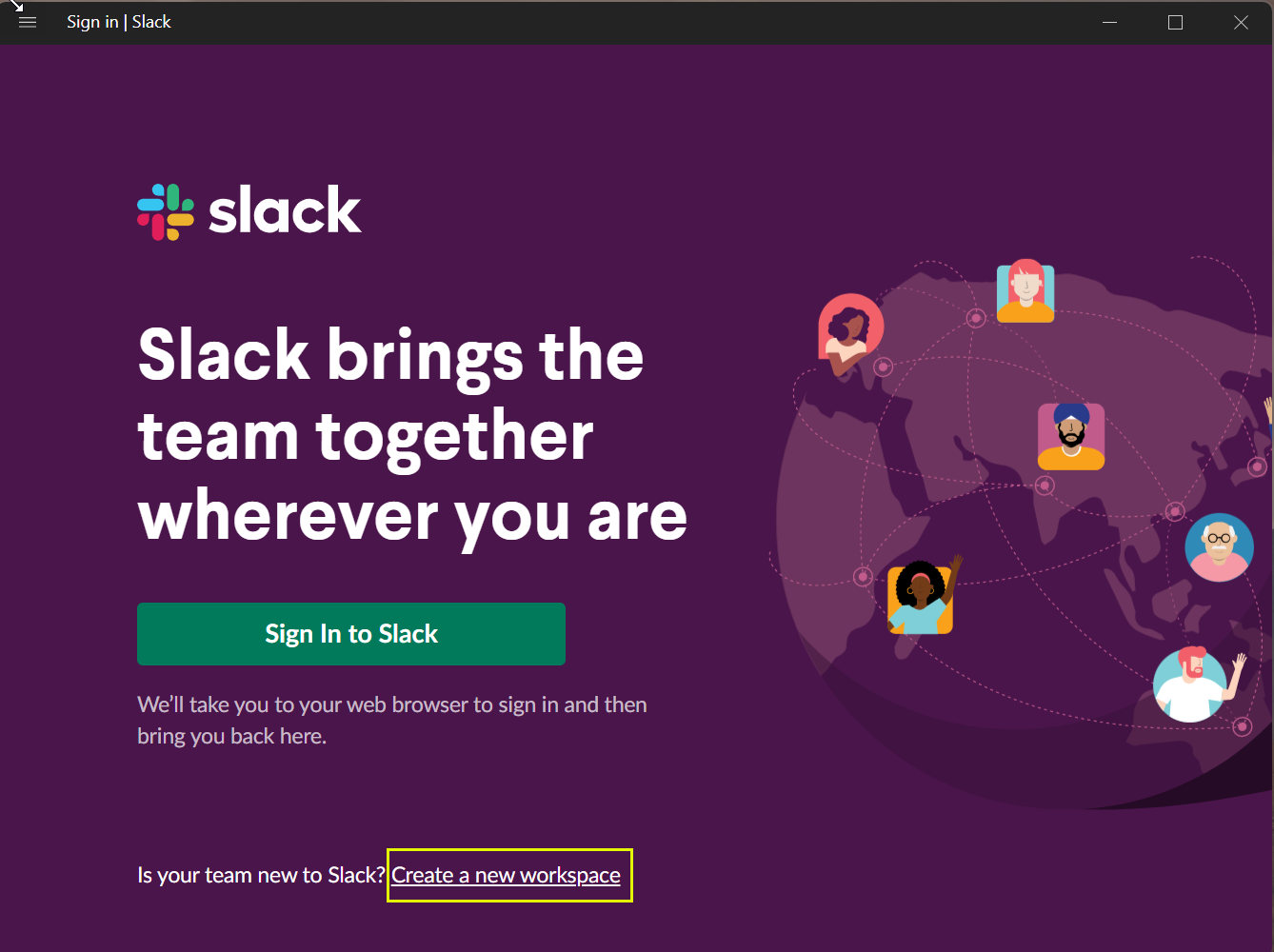 Click on Create a new workspace link. The Slack login page is displayed.