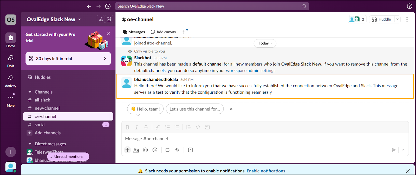 The oe-channel Slack channel is created.