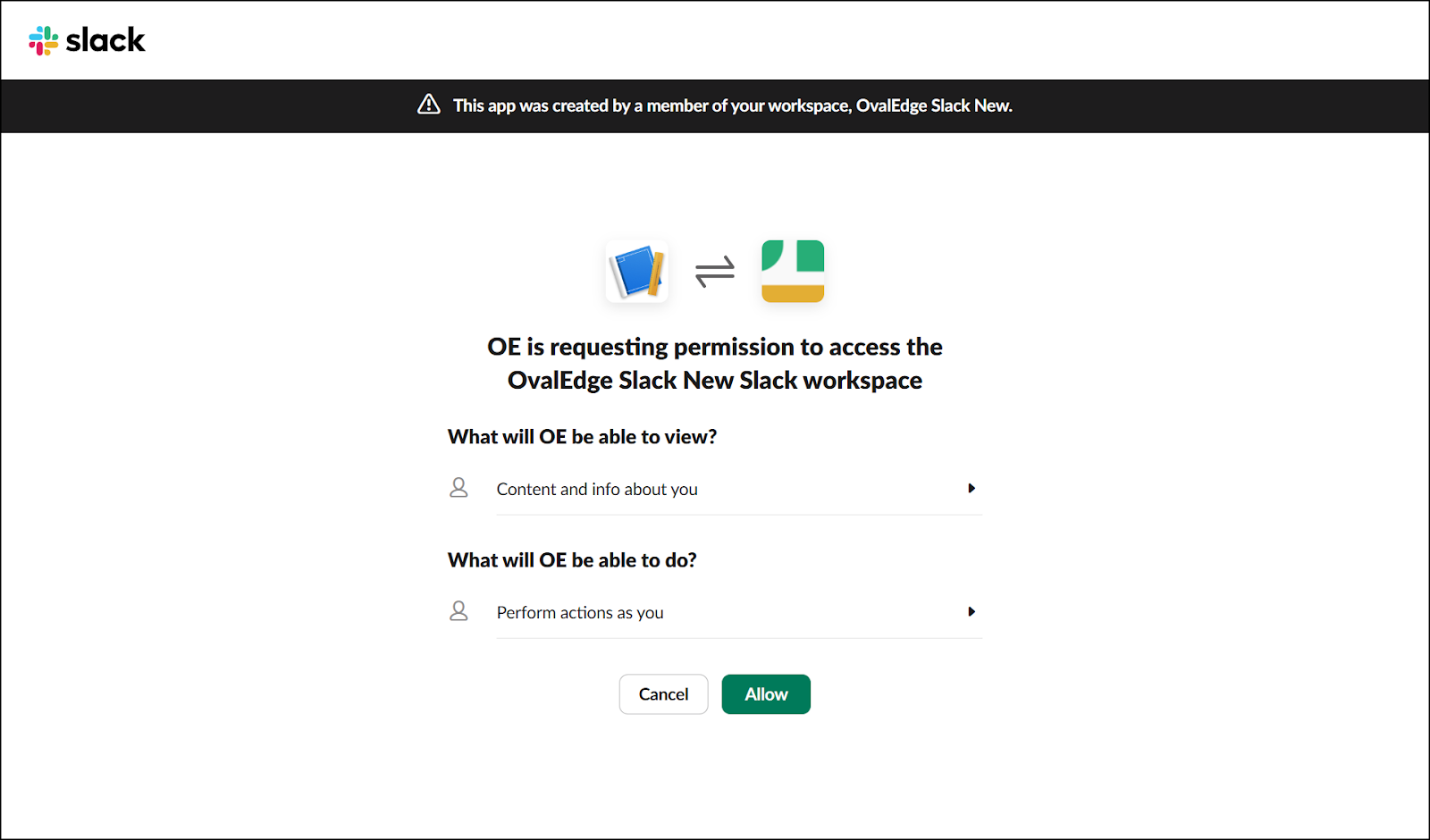 Once you have selected the permissions, click the "Install to Workspace" (here, "Install to OvalEdge Slack New") button. The confirmation page is displayed.