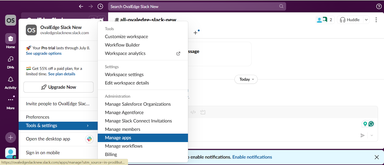 On the Slack home page, click on the workspace name and select the Tools & Settings option.