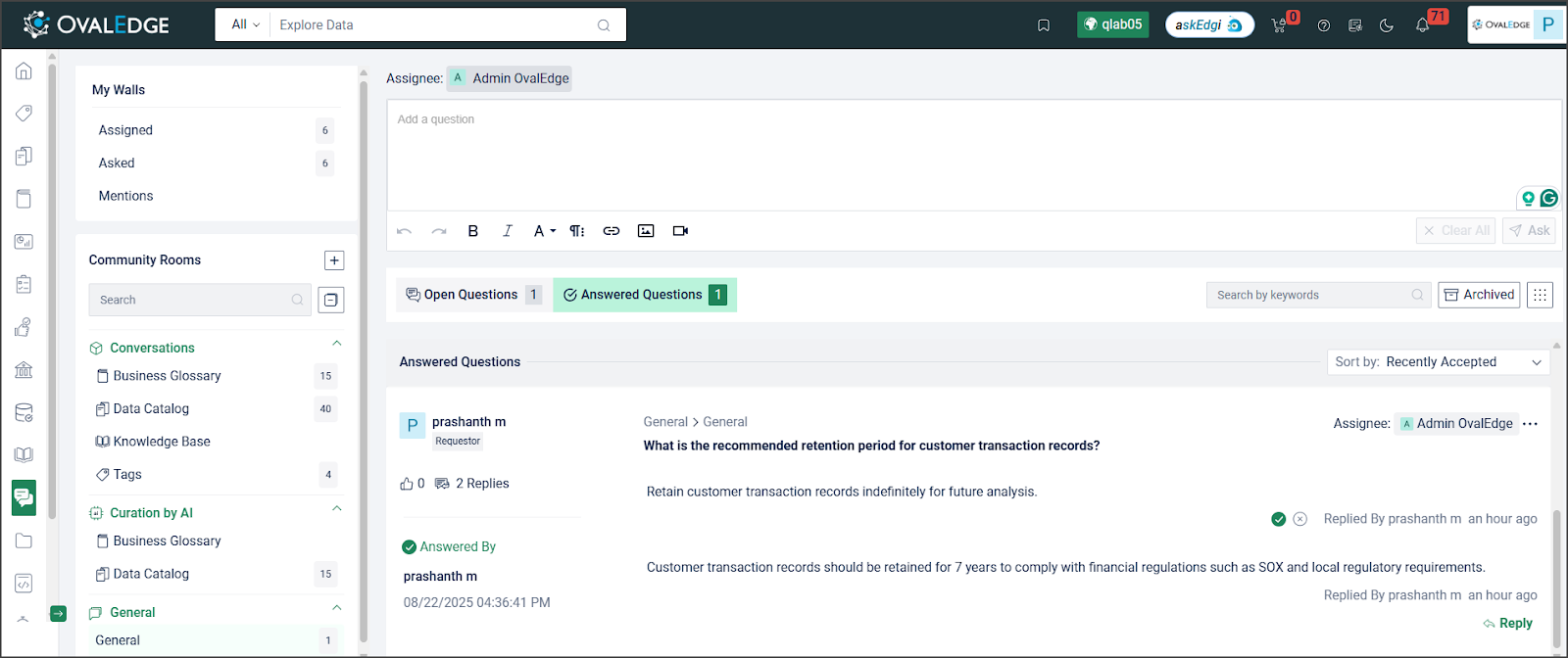 The General Wall contains all the migrated questions from earlier versions of OvalEdge. Users can add new questions and select the assignee or team from whom they want a response or answer.