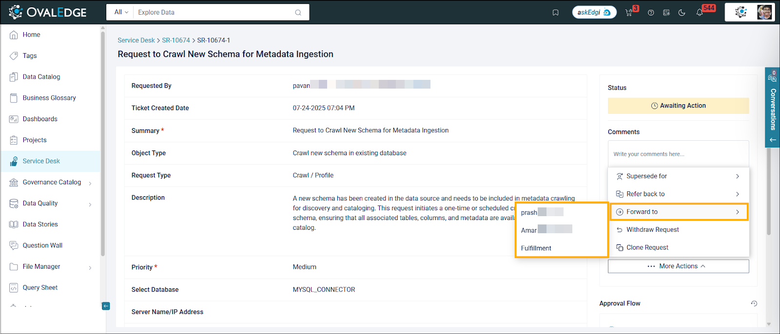 A new ‘Forward To’ option is now available when raising a service request, offering greater flexibility in the approval workflow. The ‘Forward To’ feature enables the current approver to either: