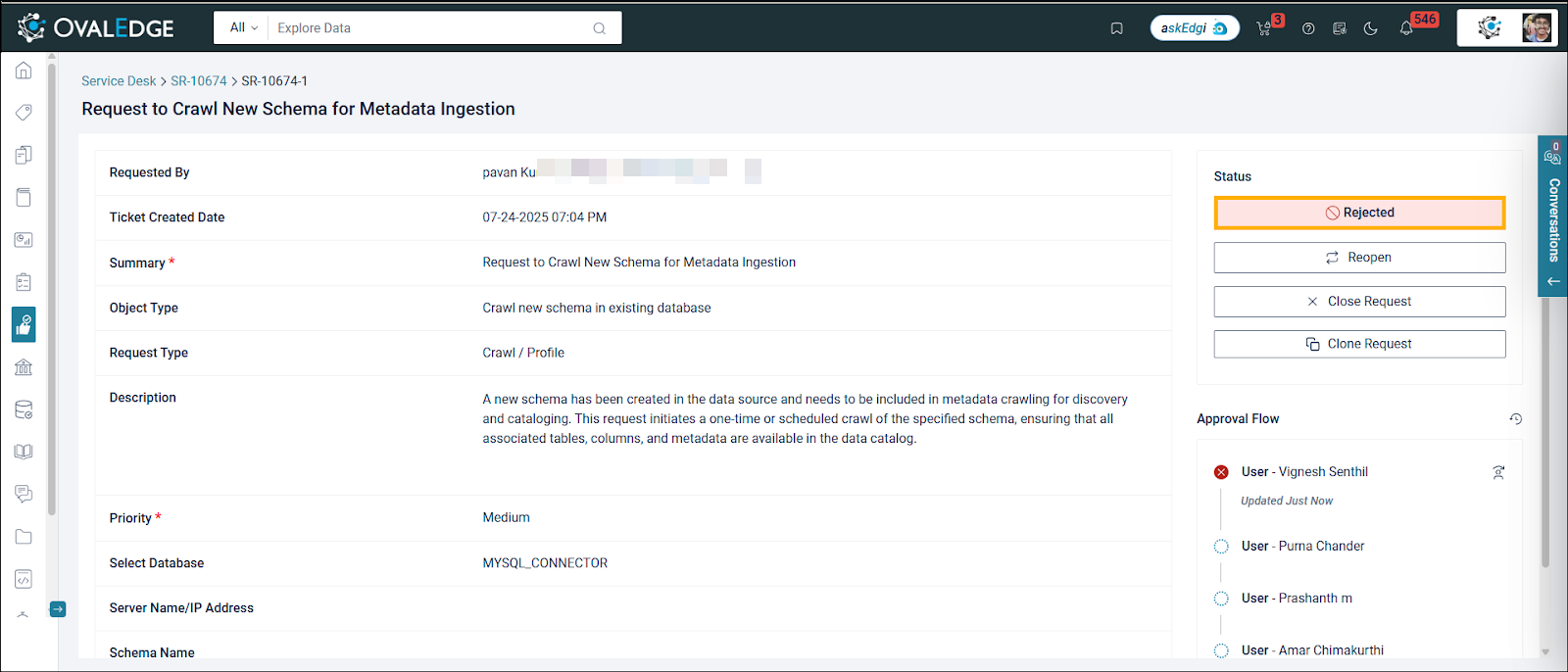 Whenever the ticket is rejected, requesters can see the comments provided by the approvers and raise a new request if necessary, or they can reopen the ticket.