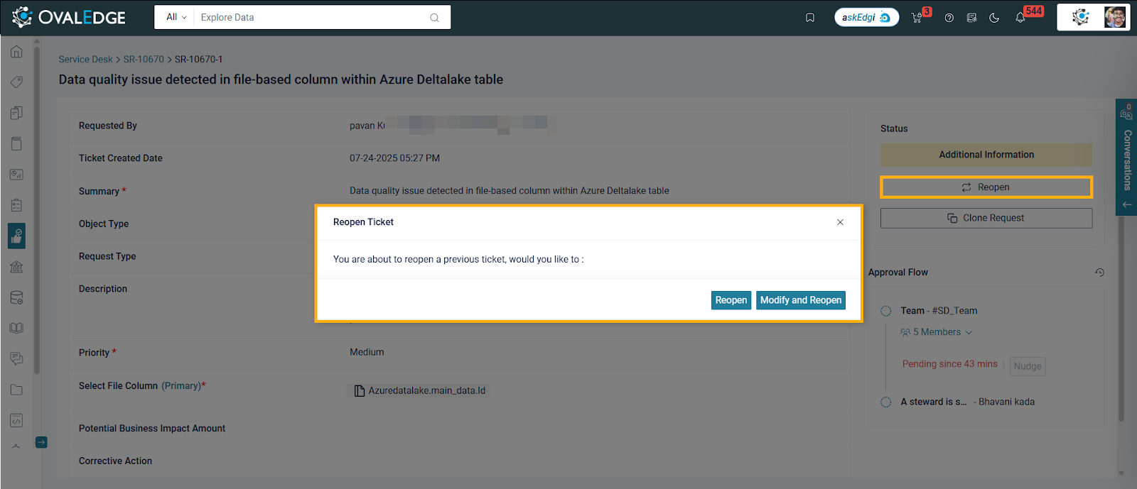 Now, the Nudge button is enabled, as shown below. Note: Users can view the duration for which the ticket has been pending approval here.