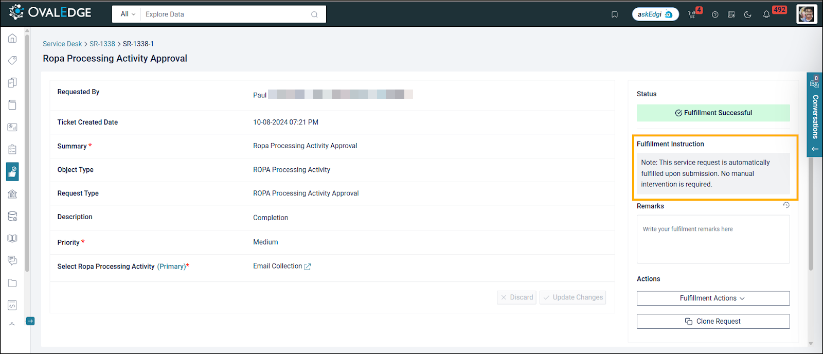 Automatic Fulfillment: In cases of automatic fulfillment, the status of fulfillment changes based on job logs. The approver can also manually adjust the fulfillment status.