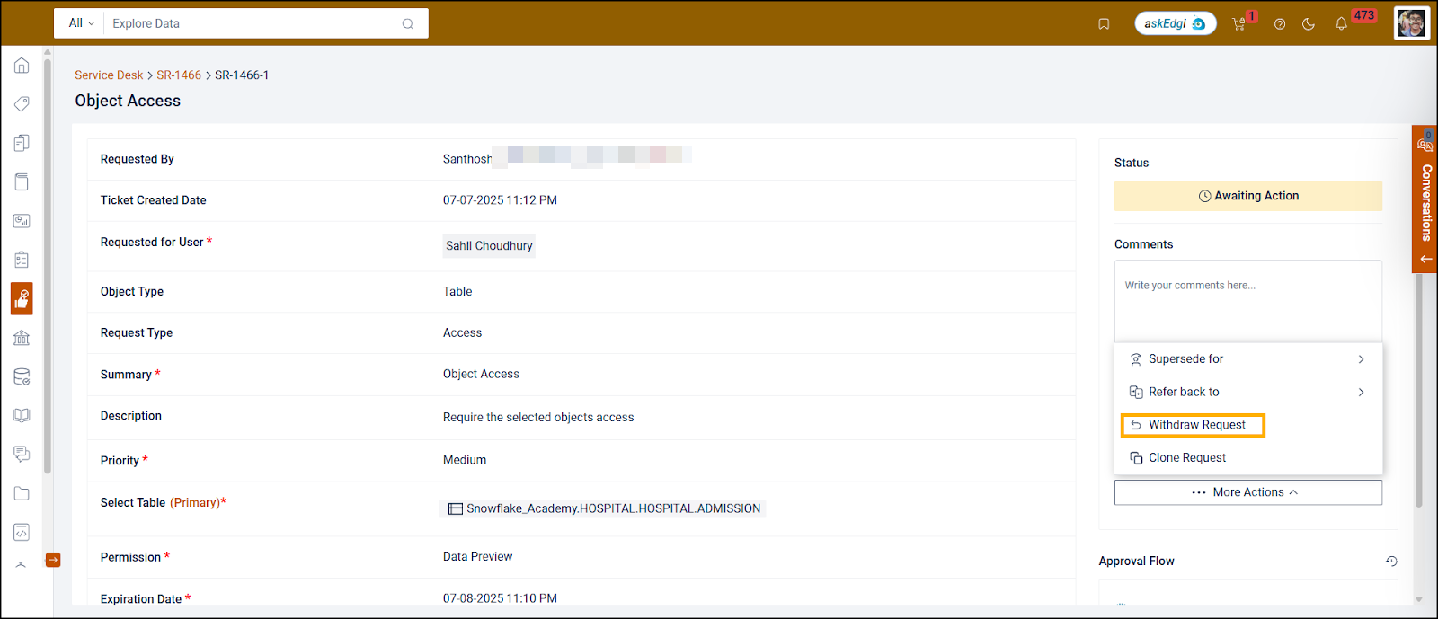 The requester can withdraw a request by providing a reason for withdrawal before it is approved/rejected by the first approver. Requesters can withdraw a ticket at the group level or sub-request level.