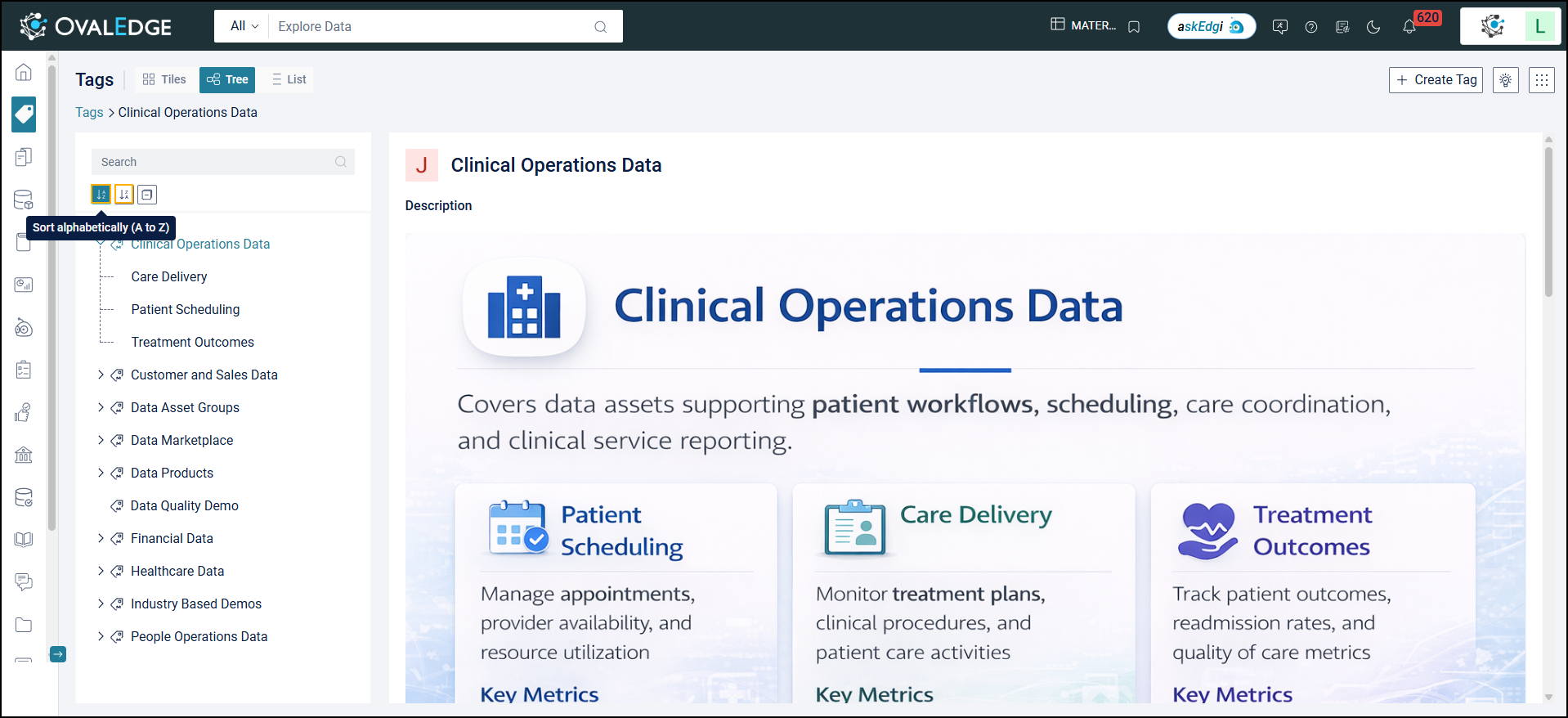 As the name suggests, Tree View displays all created tags in a hierarchical structure, showing Parent-Child and Subordinate relationships. The order begins with the Master Tag, followed by the Parent Tag, and then the Child Tags. SGA (Security & Governance Admin) users or those with a governance role on the Master Tag can create new tags. Users can search for specific tags using the left panel and sort the list alphabetically (A–Z or Z–A).