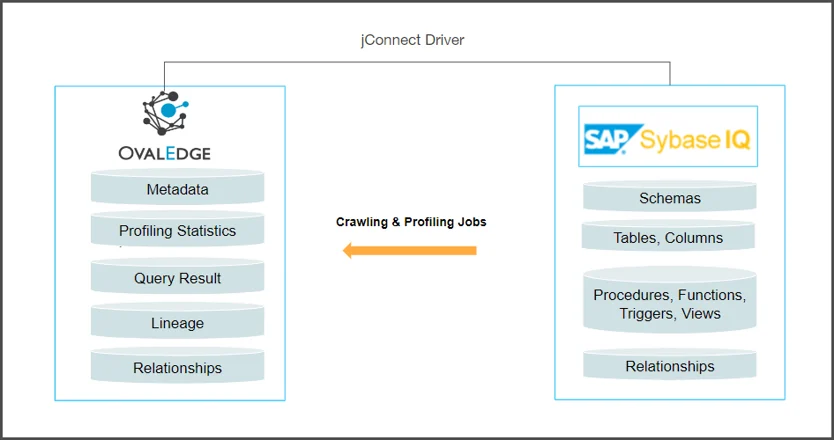 OvalEdge enables connectivity to Sybase IQ using the jConnect (jconn4) driver, allowing for tasks such as crawling database objects, profiling sample data, executing queries, building relationships, and lineage.