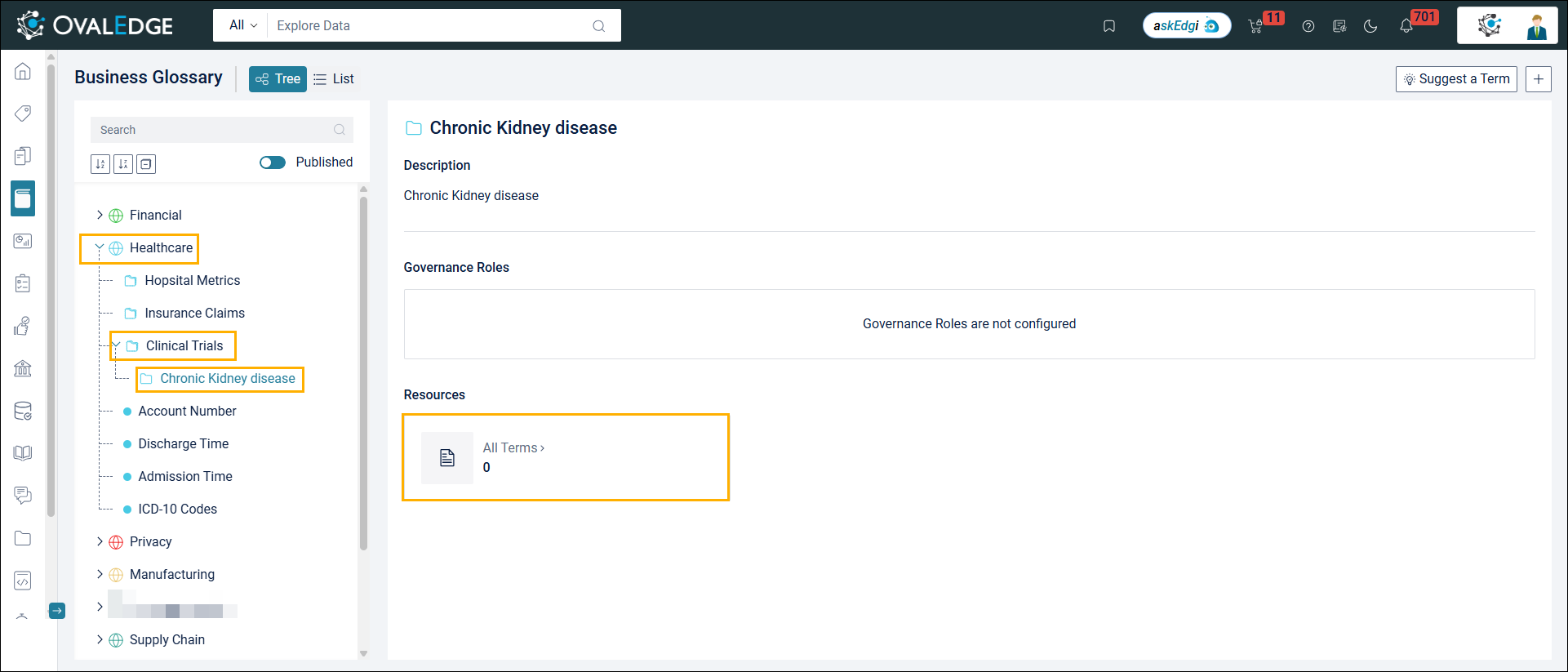 For Example, let’s consider a Domain named ‘Healthcare’ that has a category ‘Clinical Trials’ and a subcategory ‘Chronic Kidney Disease’. This Domain hierarchy (Domain, Category, and Subcategory) has no terms, but users can still view the complete Domain hierarchy.