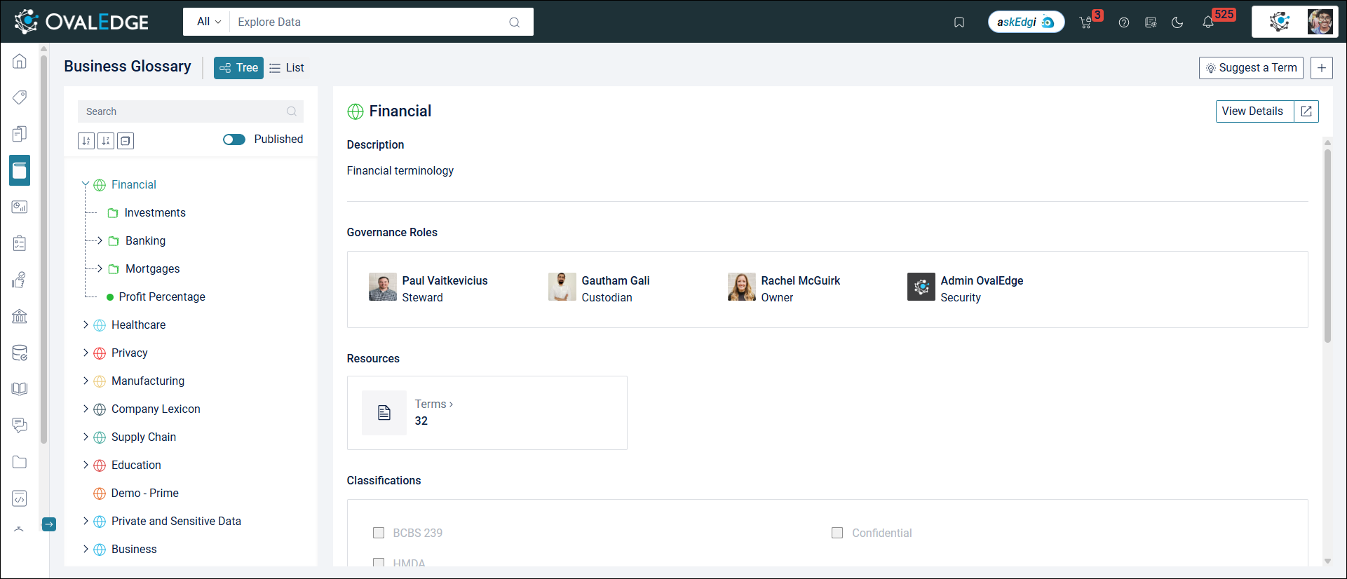 The List View makes filtering, searching, and sorting terms easy. Its simple interface lets users access term status, tags, associated projects, classifications, and Governance roles. Authorized users can also make bulk updates to selected terms.